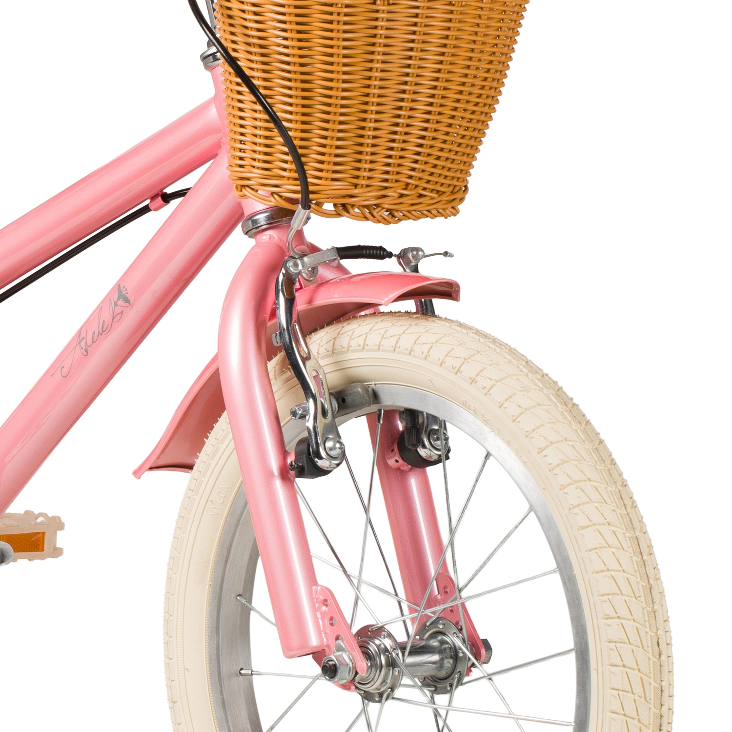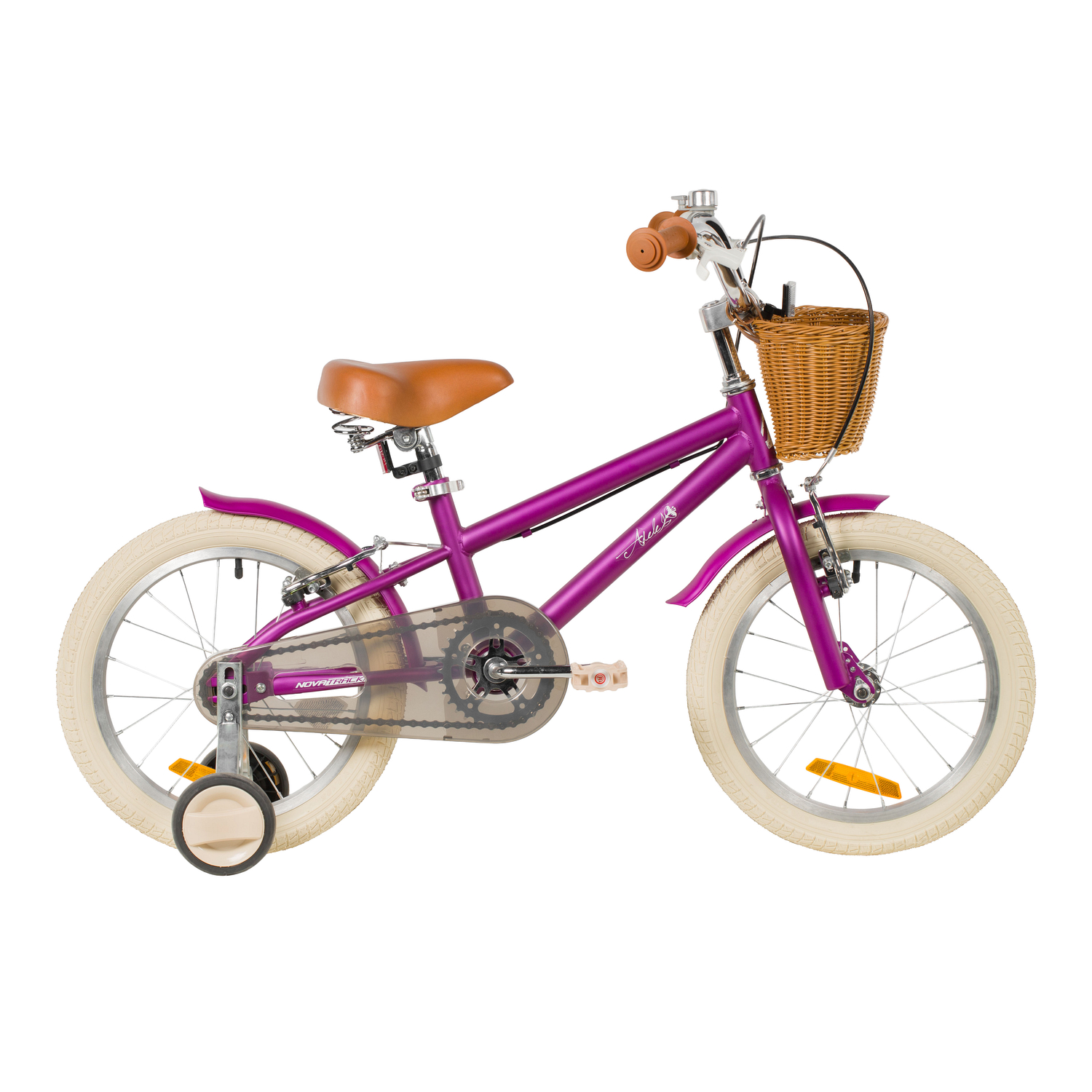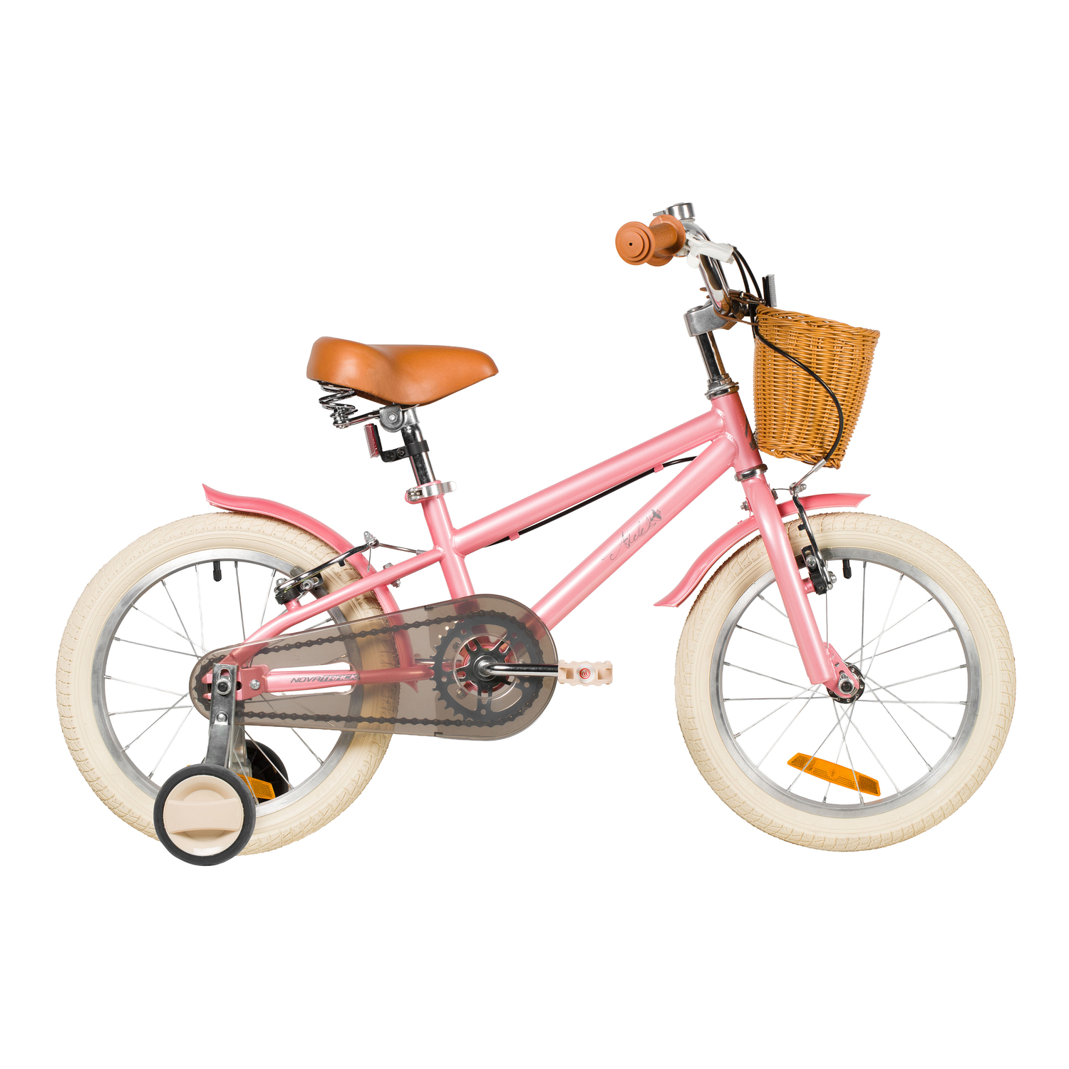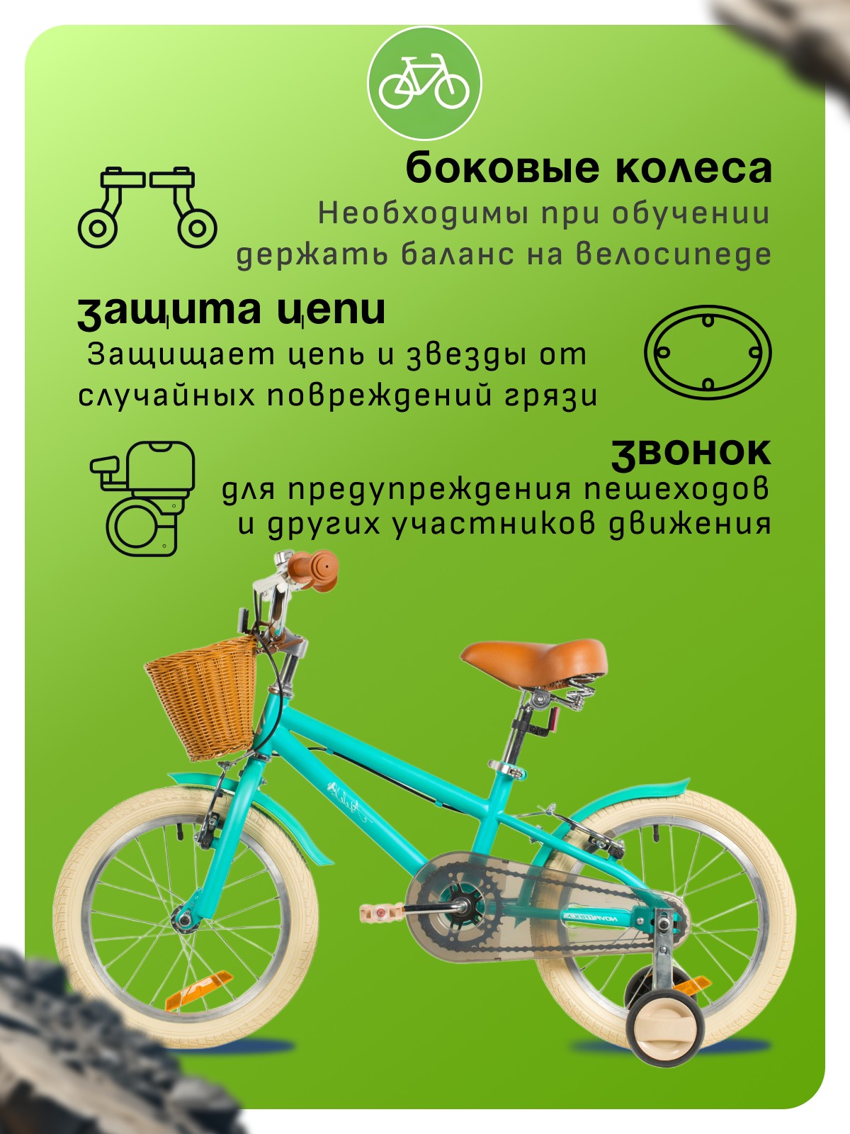 Велосипед, предназначенный для детей в возрасте от двух до четырех лет, без переключения передач. Технические особенности: прочная стальная рама, жесткая стальная вилка, одинарные алюминиевые обода (ниппель AV), ободные механические тормоза V-brake, полная защита цепи, съемные боковые колеса, крылья, передняя корзинка, звонок, катафоты. Подходит для обучения и прогулочного катания в городских условиях. Диаметр колес - 14 дюймов. Вес - 10 кг.