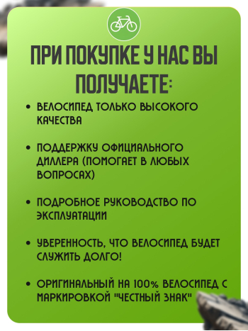 Есть ли самовывоз и торговый зал в Москве? — Да, у нас есть торговый зал, где велосипеды выставлены в собранном виде и на них можно прокатиться. Сколько стоит доставка? Стоимость рассчитывается при оформлении заказа и зависит от региона. По Москве мы доставляем велосипеды бесплатно. Сколько времени занимает доставка? По Москве 1-2 дня. По России нужно к стандартному сроку 1-2 дня прибавить еще 3-7 дней (в зависимости от удаленности города и транспортной компании). Можно оплатить при получении? При доставке по Москве и области оплатить при получении можно наличными. При покупке в регионы России оплатить при получении можно используя услугу наложенный платеж, эта услуга есть у нас. Есть ли рассрочка или кредит с удаленным оформлением? Да, можно оформить рассрочку, кредит онлайн на нашем сайте. Какие способы оплаты доступны? Наличные, банковские карты, рассрочка, кредит, карты халва, наложенный платёж. Какие есть риски при покупке велосипеда через маркет плейс? Тут надо отметить, что для правильной работы всех компонентов велосипеда важна их правильная сборка и настройка. При покупке через маркет плейс важно, чтобы сборку выполнил профессионал, иначе даже компоненты высокого уровня могут выйти из строя и потребуется не гарантийный платный ремонт. При покупке через маркет плейс гарантия на сборку и настройку не распространяется. Можно ли заказать доставку по России? Да, доставка осуществляется по всей стране транспортными компаниями и курьерской службой. Мы сами отправим Вам заказ, Вам нужно будет получить его в филиале транспортной компании Вашего города. Для некоторых городов мы можем также доставить Вам заказ до двери, но такая доставка будет стоить дороже, чем доставка в филиал транспортной компании. |