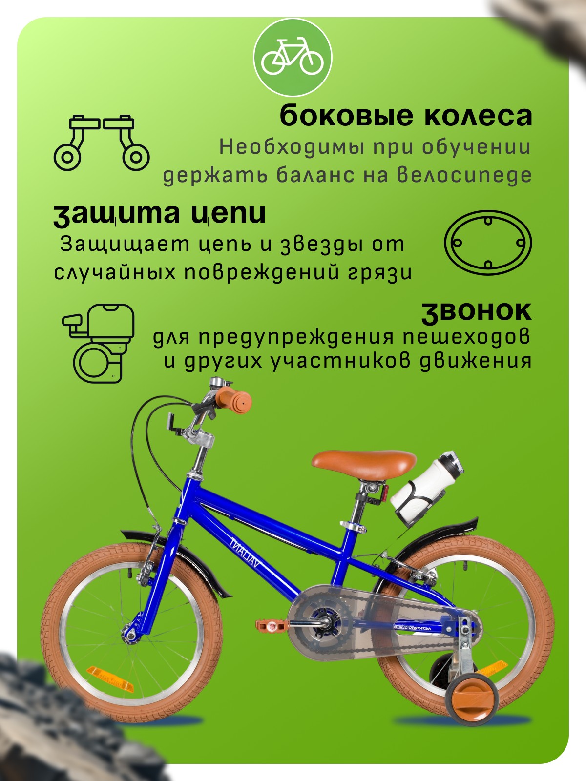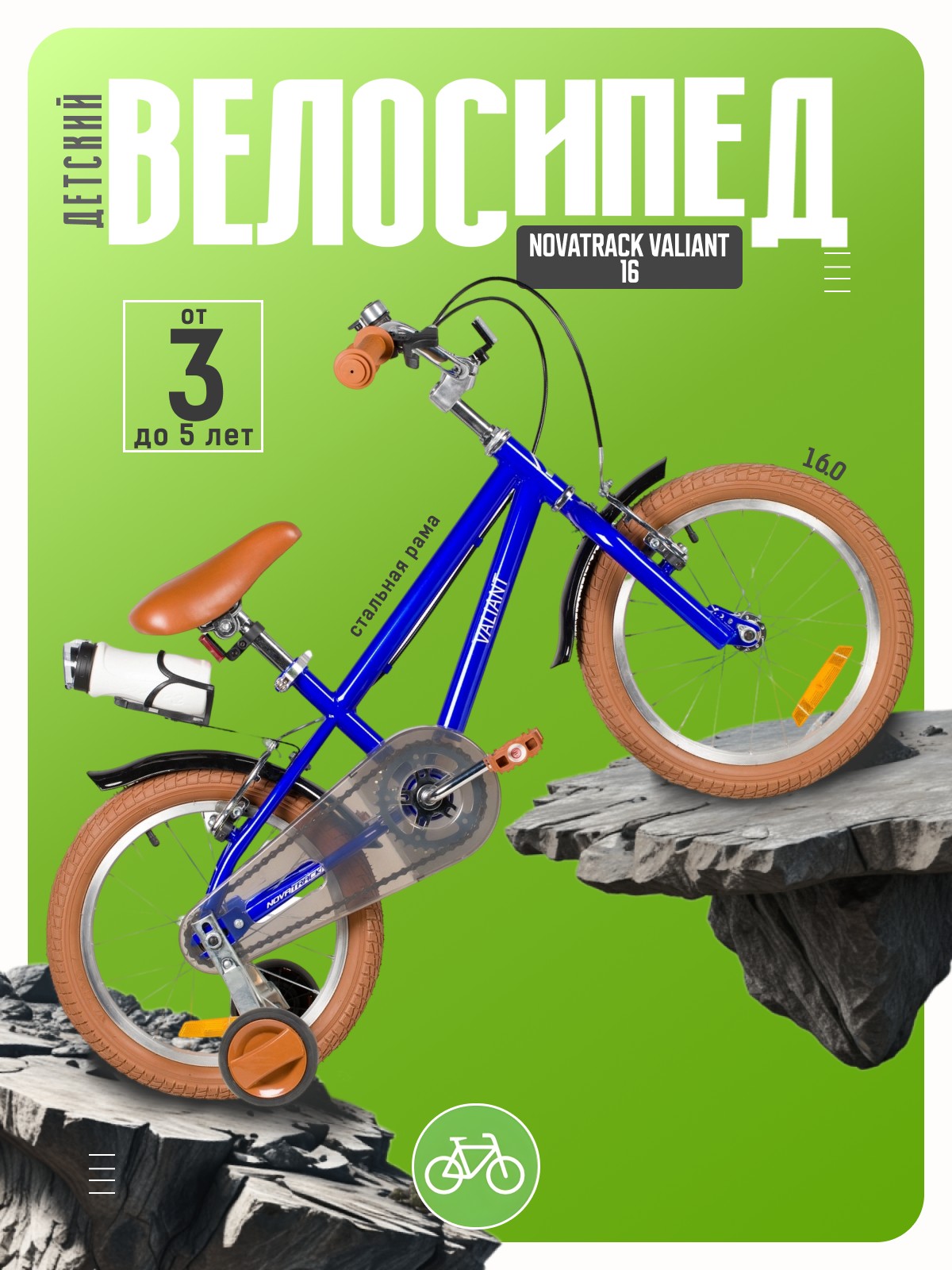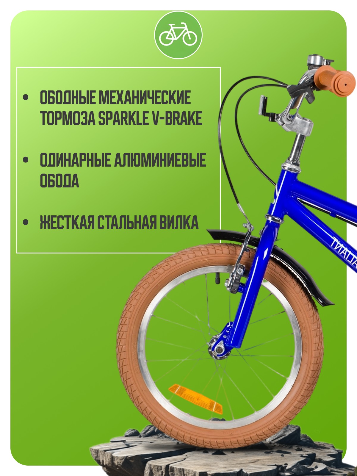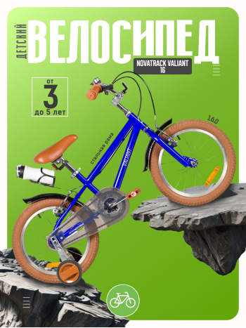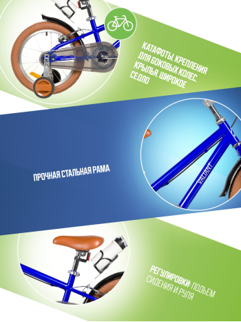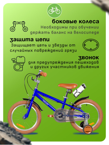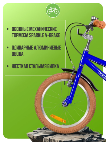 Велосипед, предназначенный для детей в возрасте от трех до шести лет, без переключения передач. Технические особенности: прочная стальная рама (открытая проводка, прямой рулевой стакан), жесткая стальная вилка, одинарные алюминиевые обода (под ниппель AV), ободные механические тормоза Sparkle V-brake (стальные рычаги), полная защита цепи, съемные боковые колеса, крылья, флягодержатель с бутылочкой, звонок, катафоты. Подходит для обучения и прогулочного катания в городских условиях. Диаметр колес - 16 дюймов. Вес - 10,3 кг.