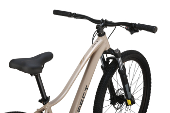 Женский горный велосипед с оборудованием начального любительского класса Shimano, 8 скоростей. Технические особенности: алюминиевая рама (сплав 6061, гидроформинг, скрытая прокладка тросов, рулевой стакан ZS, каретка BSA, крепление флягодержателя, бонки для багажника), амортизационная вилка EXSHO JUNGLE ML-P (пружинно-эластомерная, ход 100 мм, диаметр ног 28 мм), двойные алюминиевые обода Code D23 (под дисковый тормоз, ширина 23 мм, ниппель AV, 32Н), дисковые механические тормоза RPT DSC310 (роторы 160/160 мм). Подходит для активной езды по различным дорогам и пересеченной местности. Диаметр колес - 27.5 дюймов. Вес - 14,1 кг.