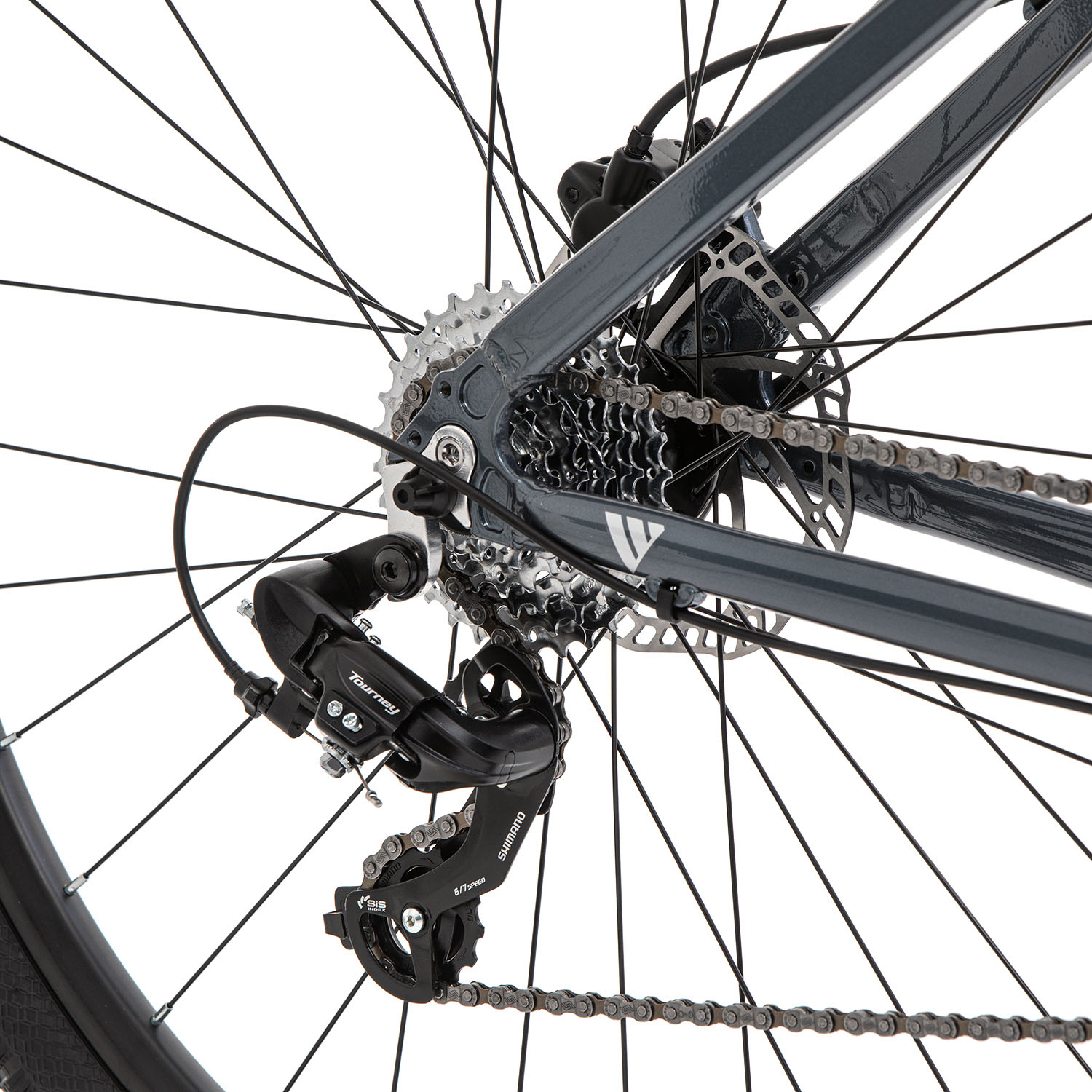 Горный велосипед с оборудованием начального класса Shimano, 7 скоростей. Технические особенности: легкая алюминиевая рама (сплав 6061, внутренняя прокладка тросов, съёмный петух, прямой рулевой стакан, крепление калипера IS, каретка BSA), амортизационная вилка 2ROXX 981 (пружинно-эластомерная, ход 100 мм, алюминиевые штаны, блокировка хода), двойные алюминиевые обода (под AV ниппель), дисковые гидравлические тормоза Tektro TKD176 (роторы 160/160 мм). Подходит для активной езды по различным дорогам и пересеченной местности. Диаметр колес - 29 дюймов. Вес - 14,7 кг.