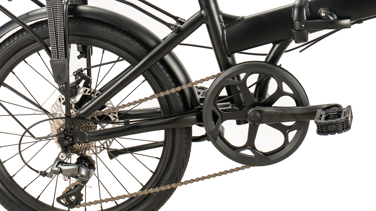 Складной прогулочный велосипед с навесным оборудованием Shimano, 7 скоростей. Технические особенности: складная алюминиевая рама (сплав 6061, открытая проводка, складная с фиксатором, кареточный стакан BSA, прямой рулевой стакан, съемный петух, крепление калипера IS), жесткая алюминиевая вилка (сплав 6061, крепление калипера IS), двойные алюминиевые обода Alloy Double Wall (под AV ниппель), дисковые механические тормоза Radius BX-350 (роторы 160/160 мм), защита цепи, длинные крылья, багажник, подножка, катафоты, чехол для переноски. Подходит для прогулочного катания в городских условиях. Диаметр колес - 20 дюйма. Вес - 14 кг.
