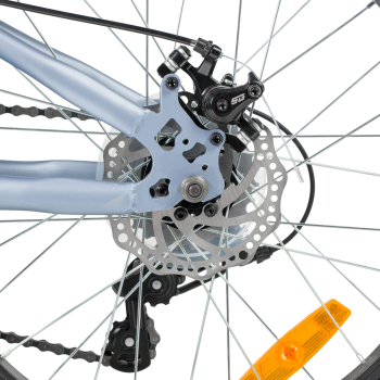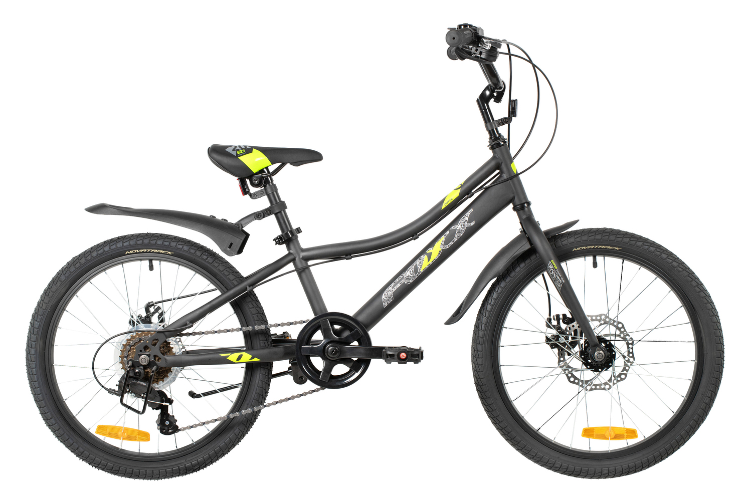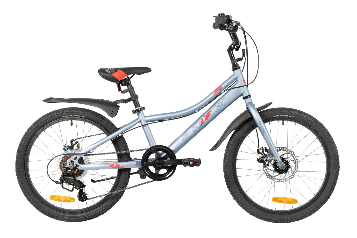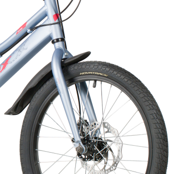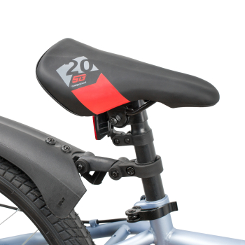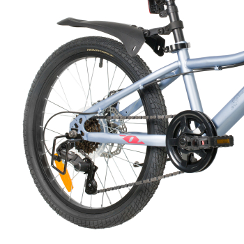 Велосипед, предназначенный для детей в возрасте от пяти до девяти лет, с оборудованием начального класса Microshift, 6 скоростей. Технические особенности: прочная стальная рама (открытая проводка, прямой рулевой стакан, кареточный стакан BSA, интегрированный петух, крепление калипера IS), жесткая стальная вилка (крепление калипера IS), двойные алюминиевые обода (под AV ниппель), дисковые механические тормоза STG (роторы 160/140 мм), защита цепи, защита заднего переключателя, катафоты, звонок, подножка. Подходит для обучения и прогулочного катания в городских условиях. Диаметр колес - 20 дюймов. Вес - 13 кг.