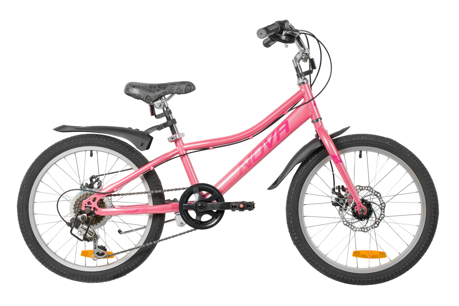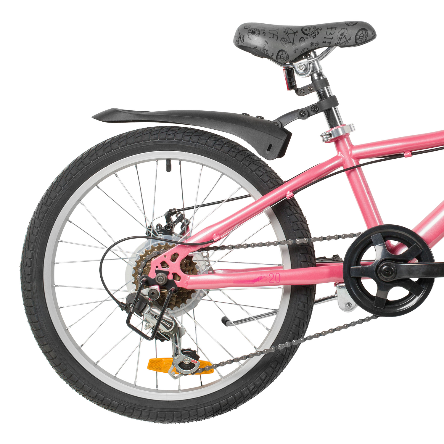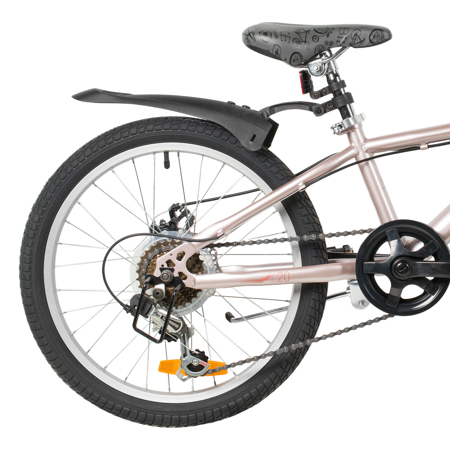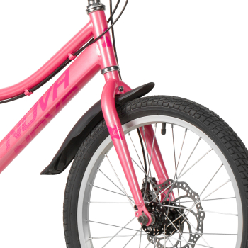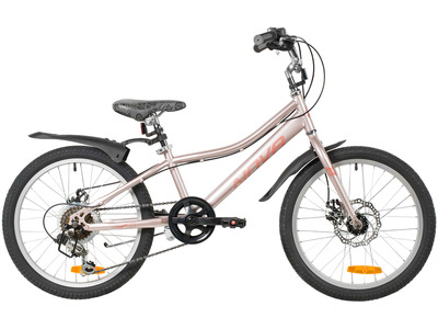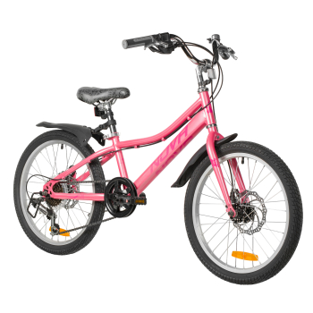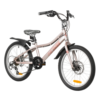Велосипед, предназначенный для девочек в возрасте от пяти до девяти лет, с оборудованием начального класса Shimano, 6 скоростей. Технические особенности: прочная стальная рама (открытая проводка, прямой рулевой стакан, кареточный стакан BSA, крепление калипера IS), жесткая стальная вилка (крепление калипера IS), двойные алюминиевые обода (под AV ниппель), дисковые механические тормоза STG (роторы 160/140 мм), пластиковые крылья, защита цепи, защита заднего переключателя, катафоты, звонок, подножка. Подходит для обучения и прогулочного катания в городских условиях. Диаметр колес - 20 дюйма. Вес - 13 кг.