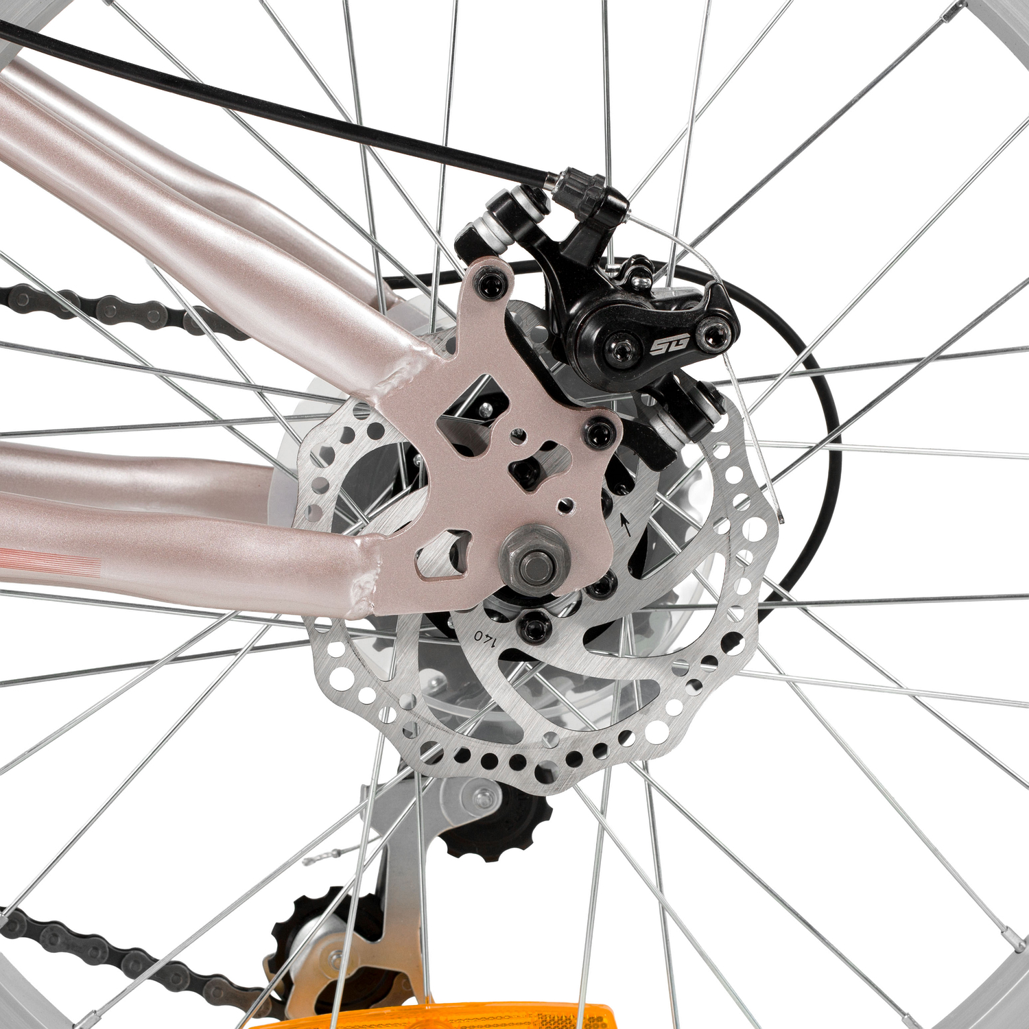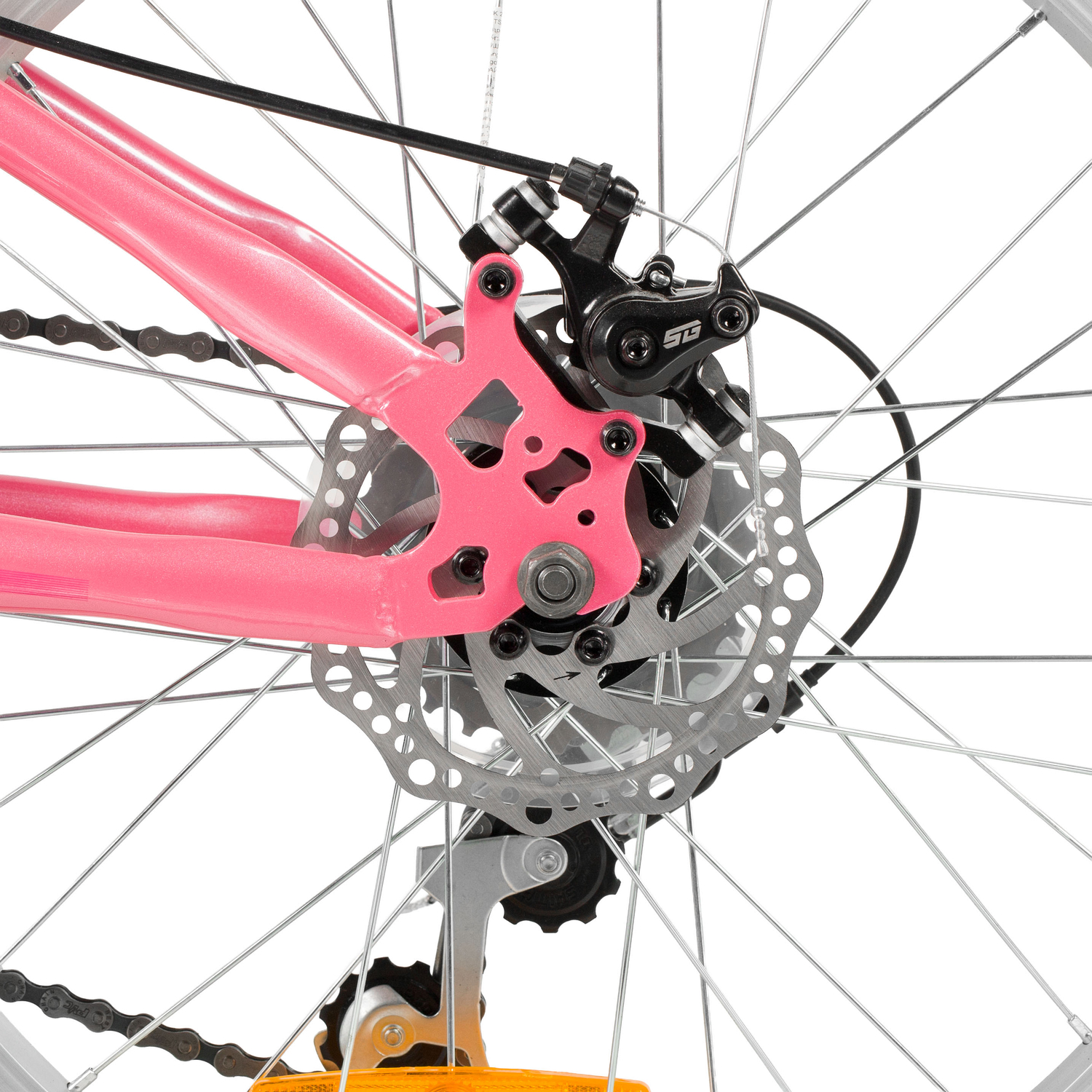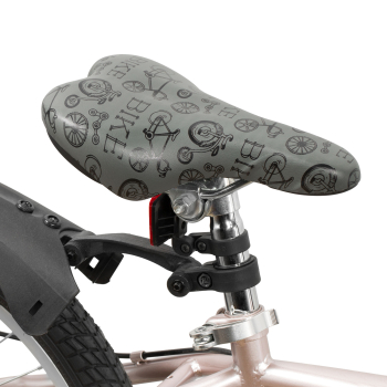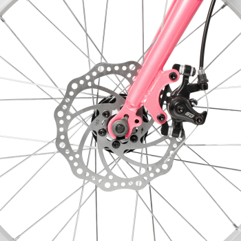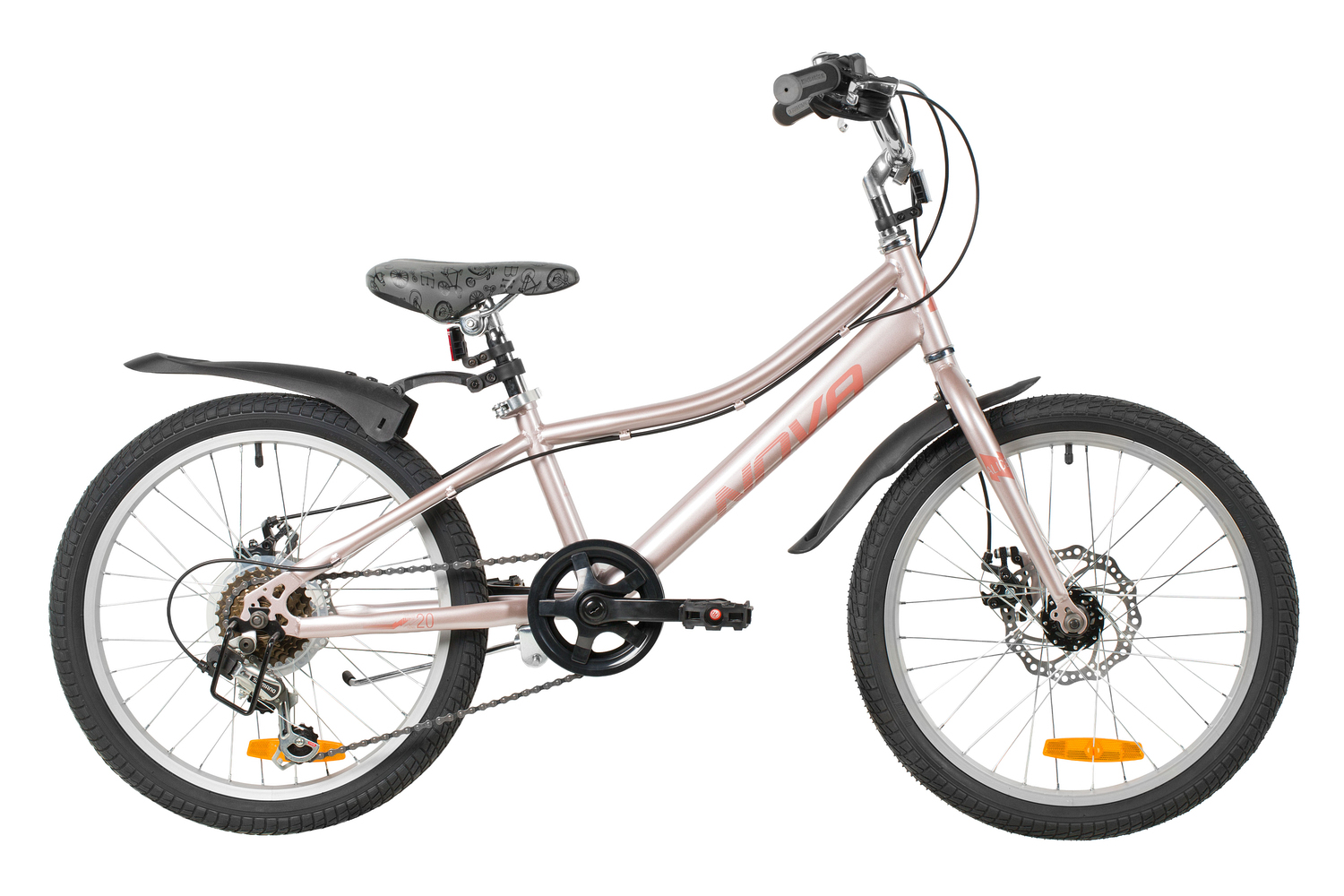 Велосипед, предназначенный для девочек в возрасте от пяти до девяти лет, с оборудованием начального класса Shimano, 6 скоростей. Технические особенности: прочная стальная рама (открытая проводка, прямой рулевой стакан, кареточный стакан BSA, крепление калипера IS), жесткая стальная вилка (крепление калипера IS), двойные алюминиевые обода (под AV ниппель), дисковые механические тормоза STG (роторы 160/140 мм), пластиковые крылья, защита цепи, защита заднего переключателя, катафоты, звонок, подножка. Подходит для обучения и прогулочного катания в городских условиях. Диаметр колес - 20 дюйма. Вес - 13 кг.
