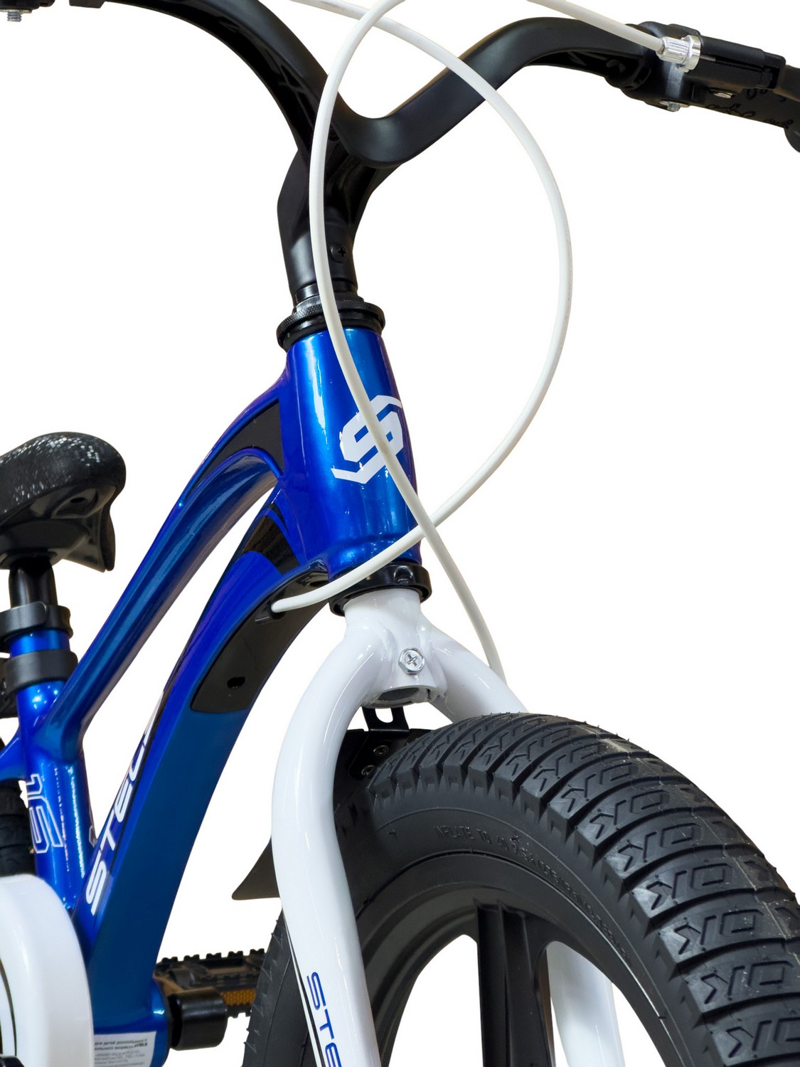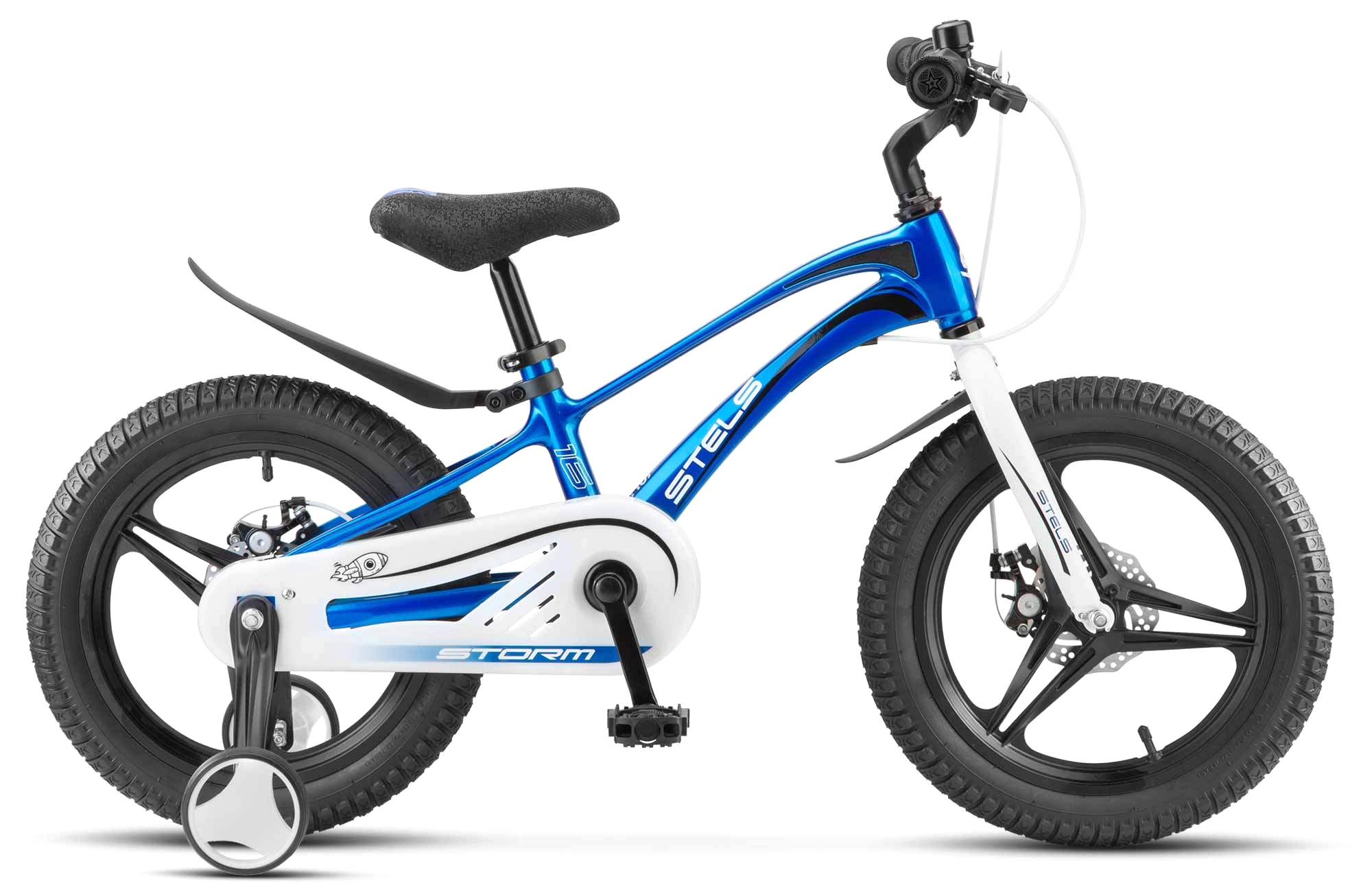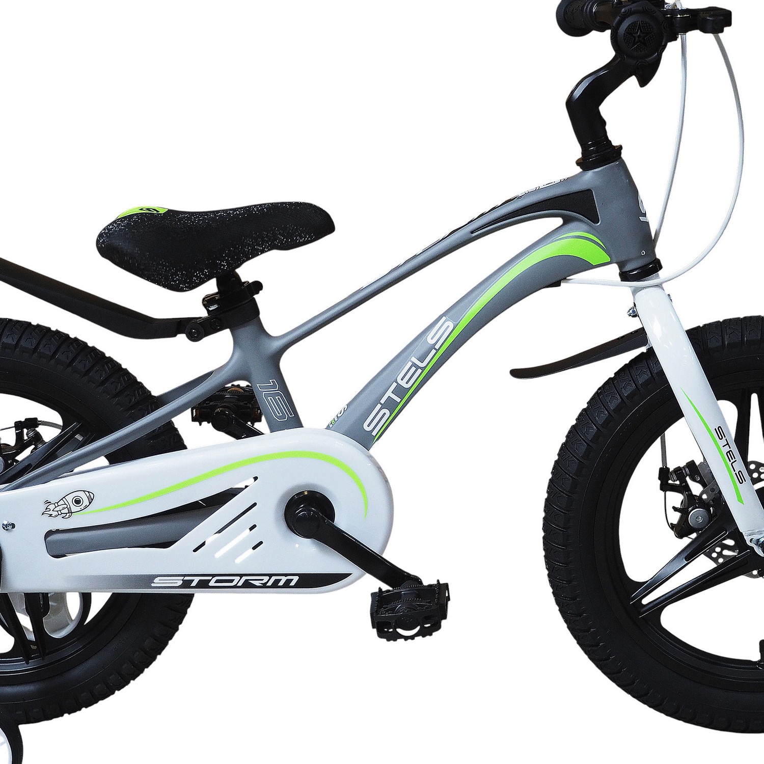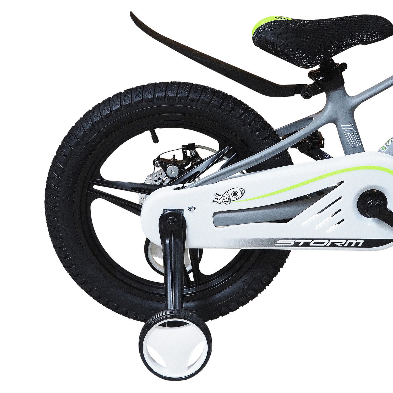 Велосипед, предназначенный для детей в возрасте от трех до шести лет, без переключения передач. Технические особенности: легкая рама из магниевого сплава (скрытая проводка, прямой рулевой стакан, кареточный стакан BSA, крепление калипера IS), жесткая стальная вилка (крепление калипера IS), литые магниевые колеса (под ниппель AV), дисковые механические тормоза (роторы 120/120 мм), полная защита цепи, съемные боковые колеса, крылья, звонок. Подходит для обучения и прогулочного катания в городских условиях. Диаметр колес - 16 дюймов. Вес - 8,9 кг.