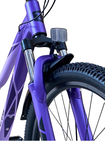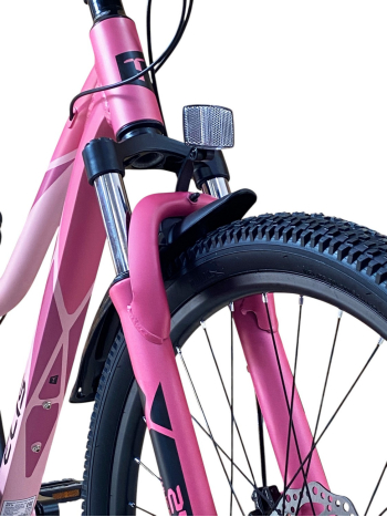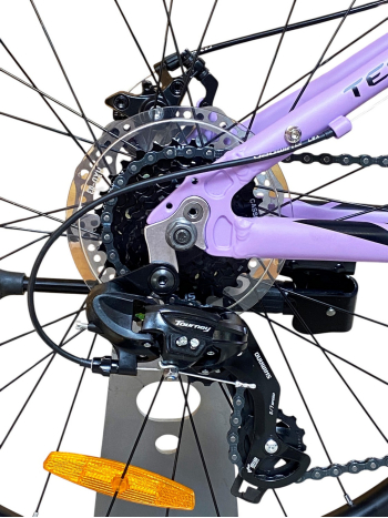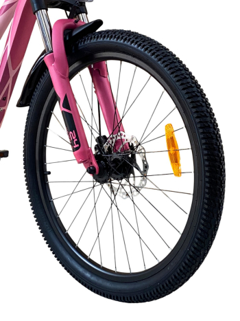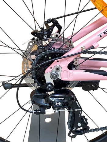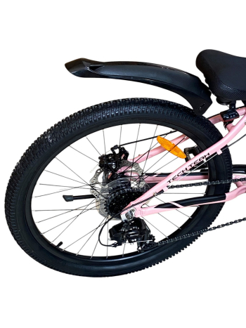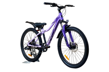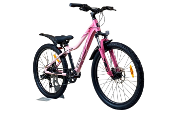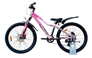 Подростковый велосипед для девочек с оборудованием начального класса Shimano/Microshift, 7 скоростей. Технические особенности: алюминиевая рама (частично скрытая проводка, прямой рулевой стакан, кареточный стакан BSA, съемный петух, крепление калипера IS), амортизационная вилка (пружинно-эластомерная, крепление калипера IS), двойные алюминиевые обода (под ниппель AV), дисковые механические тормоза (роторы 160/160 мм), защита цепи, пластиковые крылья, катафоты, подножка. Подходит для прогулочного катания по различным дорогам и пересеченной местности. Диаметр колес - 24 дюйма. Вес - 14 кг.