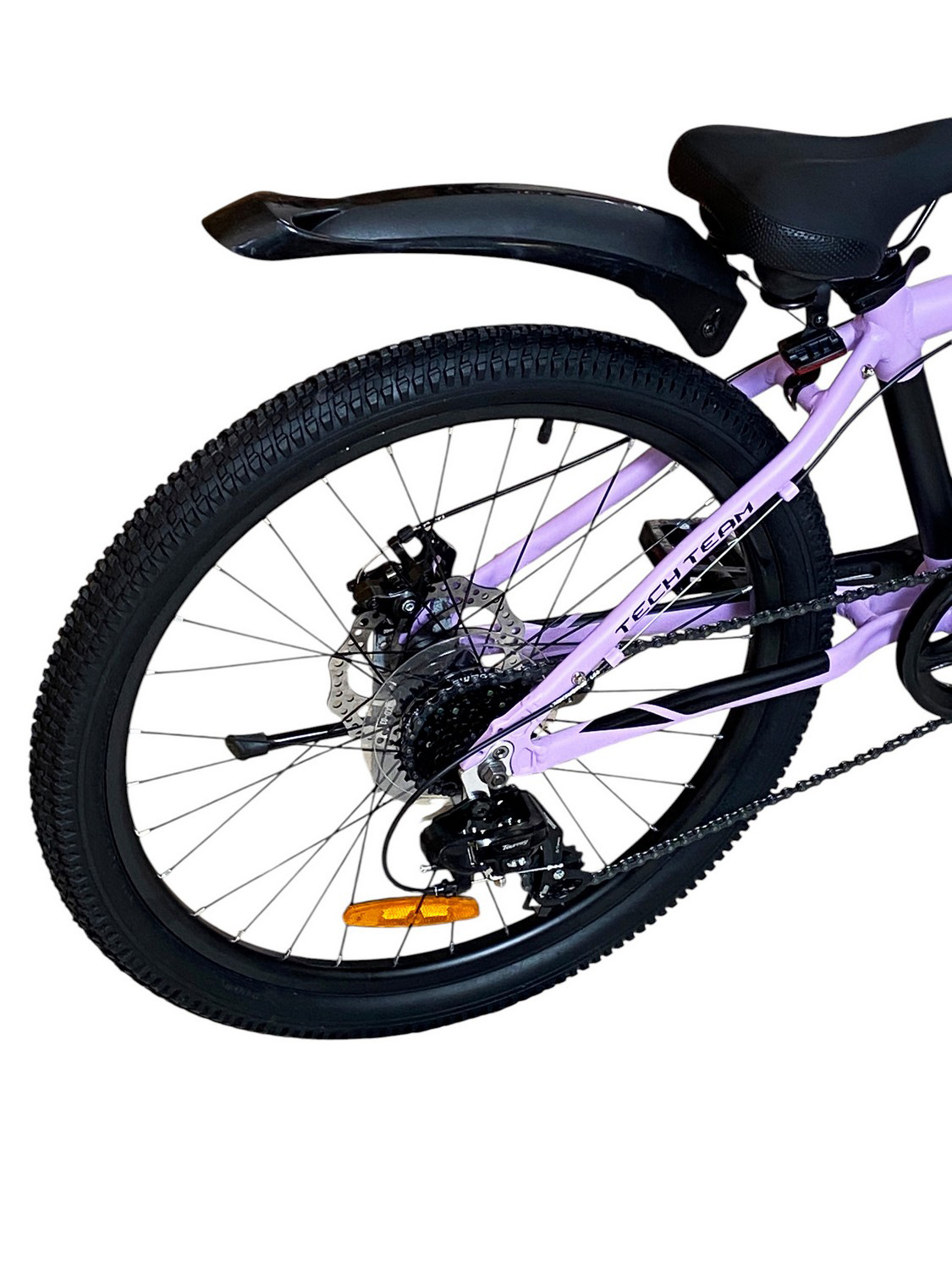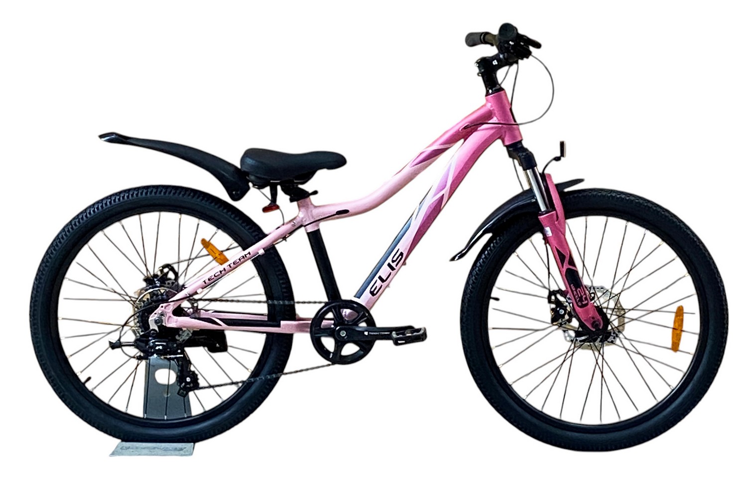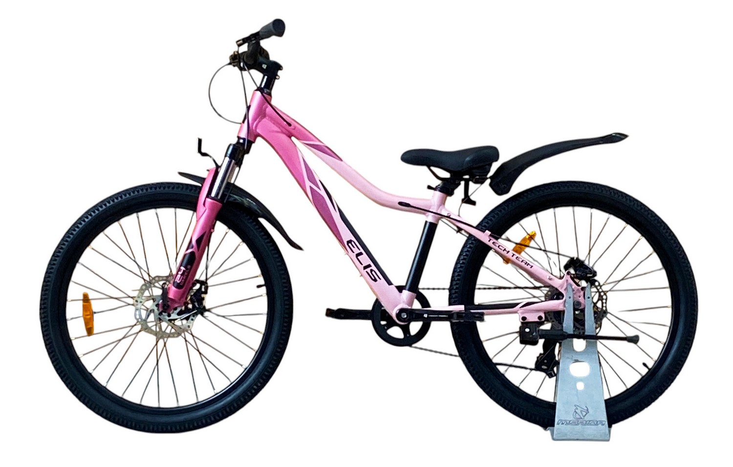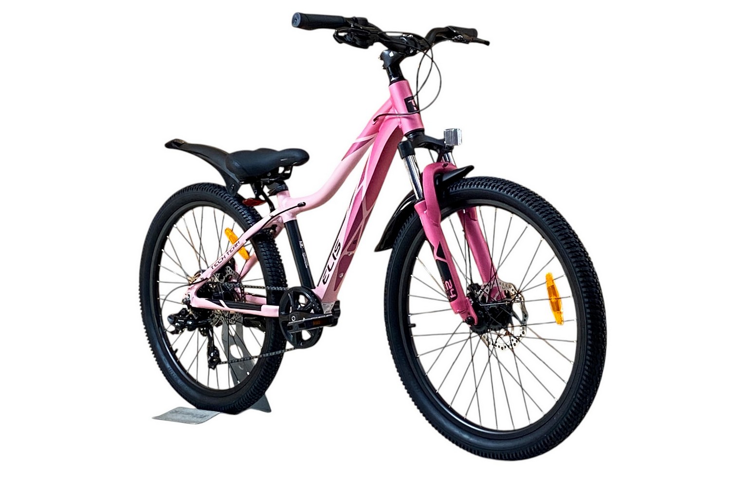 Подростковый велосипед для девочек с оборудованием начального класса Shimano/Microshift, 7 скоростей. Технические особенности: алюминиевая рама (частично скрытая проводка, прямой рулевой стакан, кареточный стакан BSA, съемный петух, крепление калипера IS), амортизационная вилка (пружинно-эластомерная, крепление калипера IS), двойные алюминиевые обода (под ниппель AV), дисковые механические тормоза (роторы 160/160 мм), защита цепи, пластиковые крылья, катафоты, подножка. Подходит для прогулочного катания по различным дорогам и пересеченной местности. Диаметр колес - 24 дюйма. Вес - 14 кг.