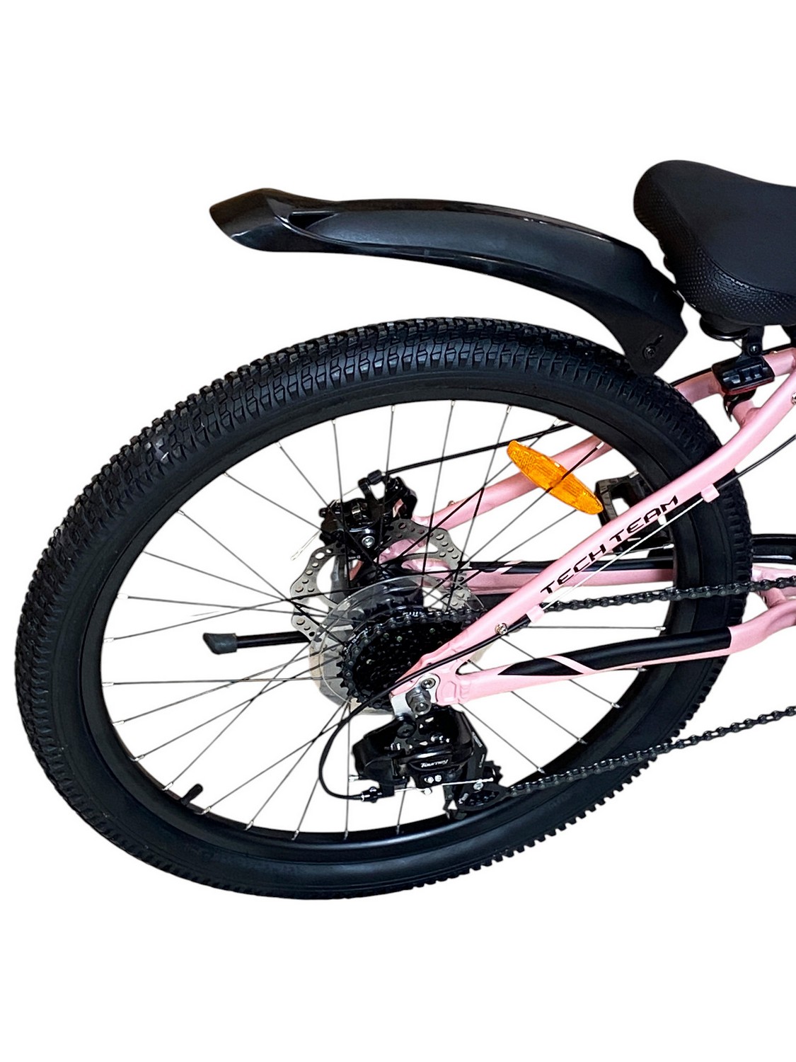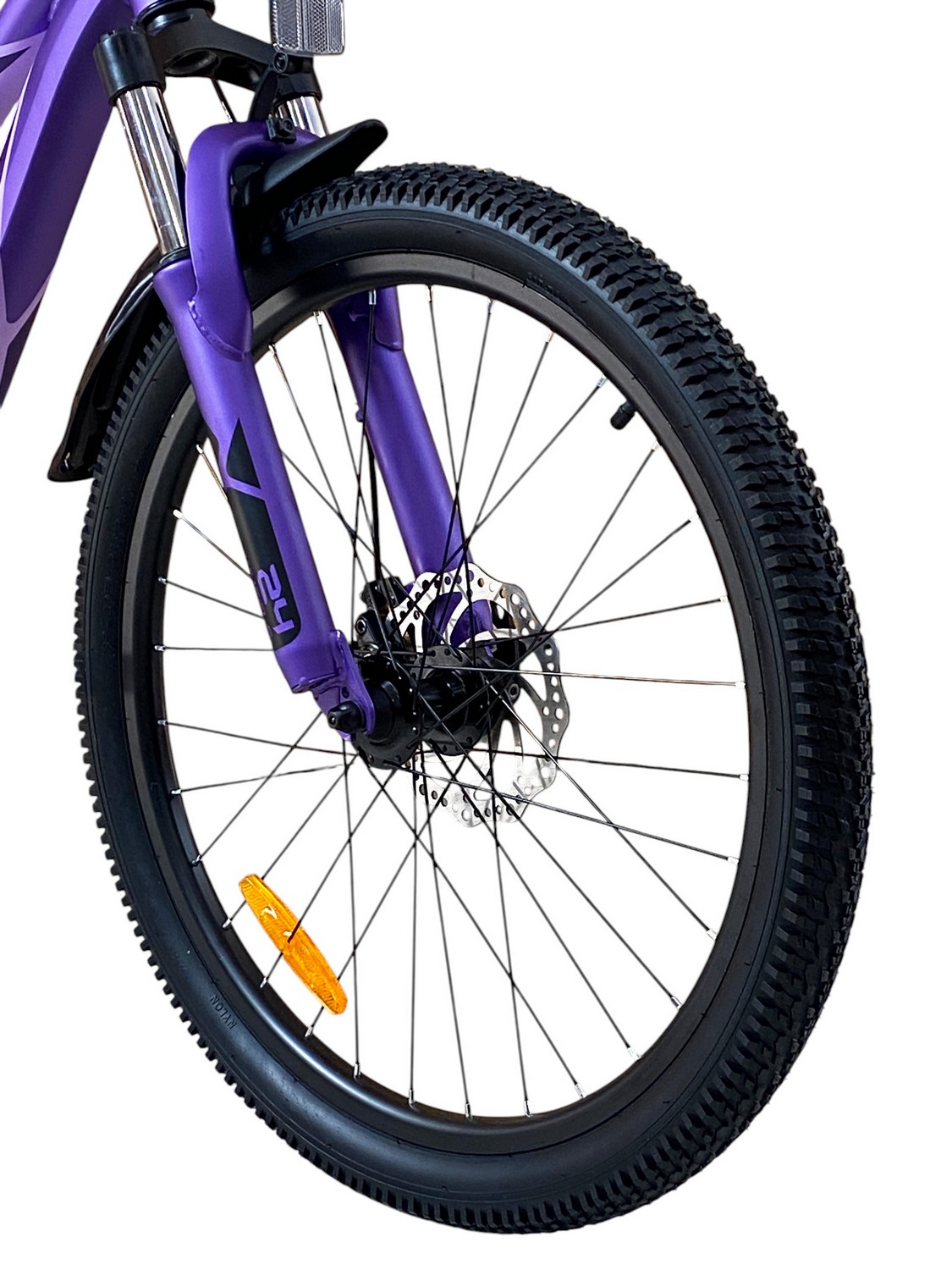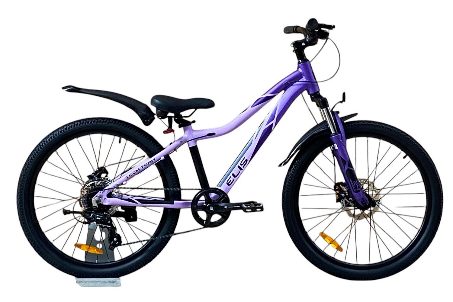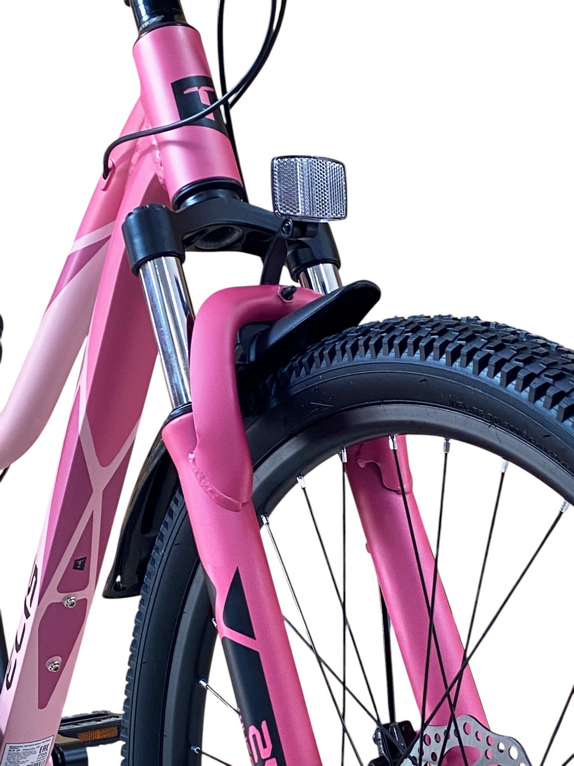 Подростковый велосипед для девочек с оборудованием начального класса Shimano/Microshift, 7 скоростей. Технические особенности: алюминиевая рама (частично скрытая проводка, прямой рулевой стакан, кареточный стакан BSA, съемный петух, крепление калипера IS), амортизационная вилка (пружинно-эластомерная, крепление калипера IS), двойные алюминиевые обода (под ниппель AV), дисковые механические тормоза (роторы 160/160 мм), защита цепи, пластиковые крылья, катафоты, подножка. Подходит для прогулочного катания по различным дорогам и пересеченной местности. Диаметр колес - 24 дюйма. Вес - 14 кг.