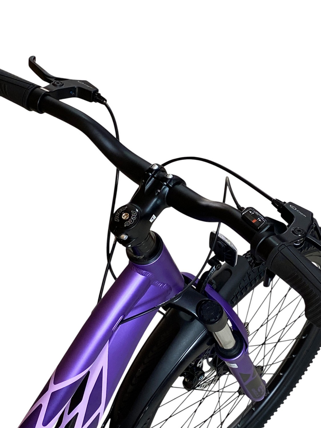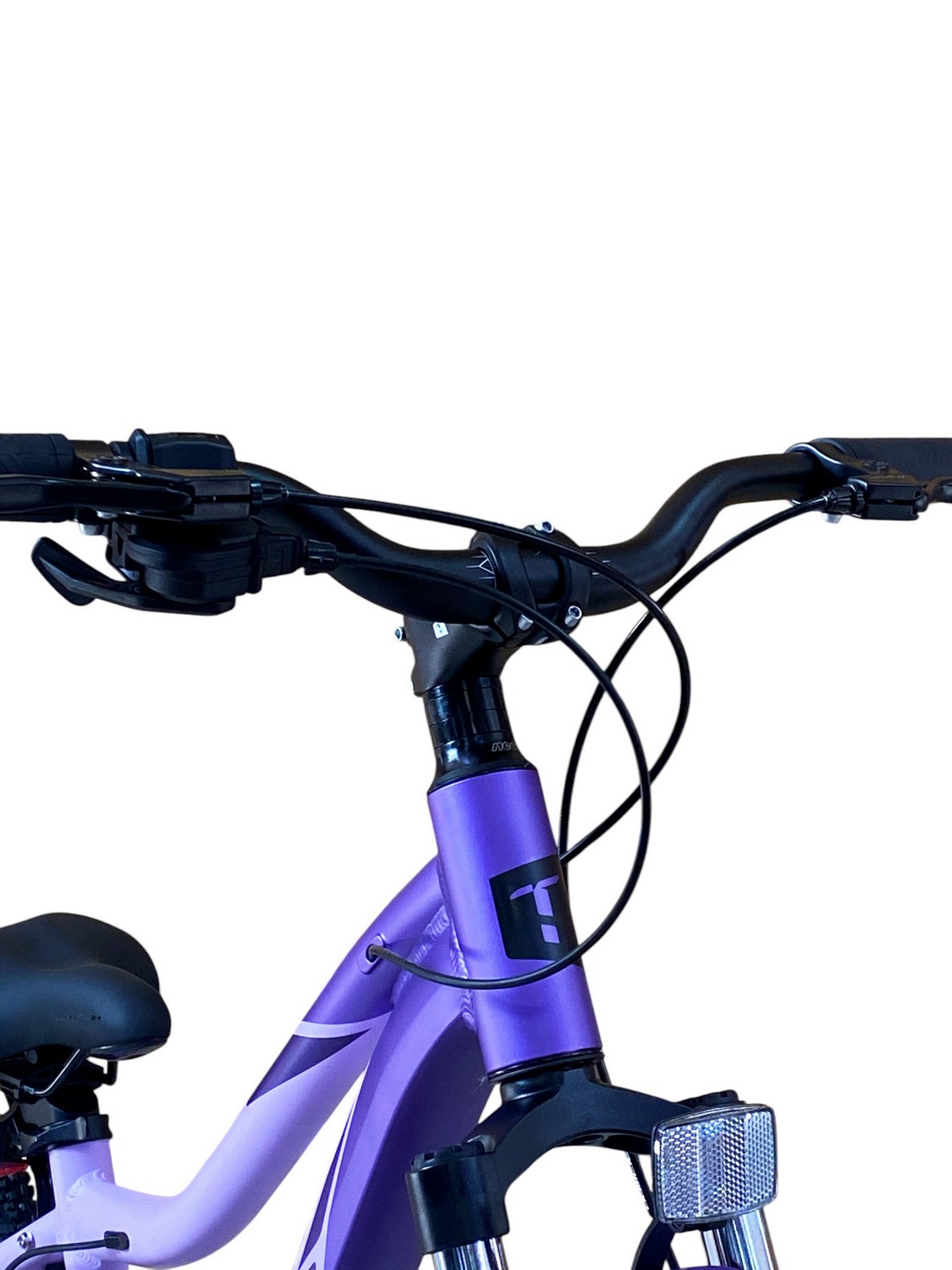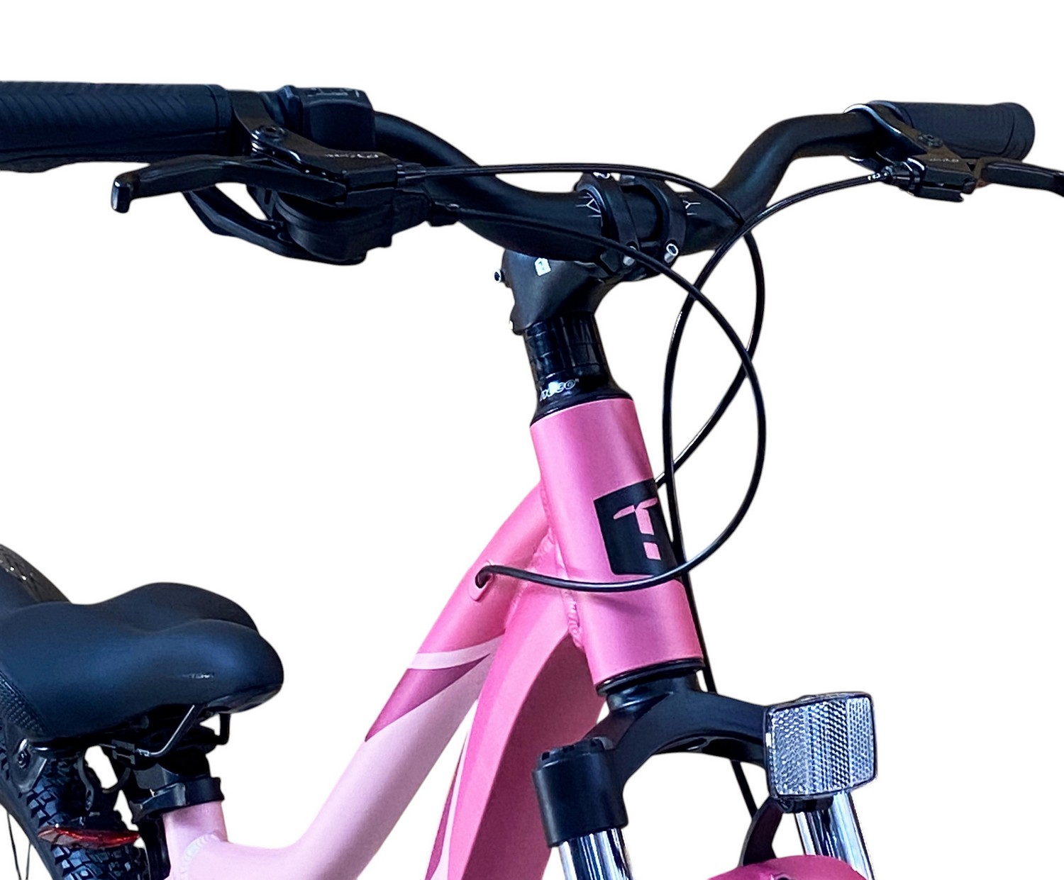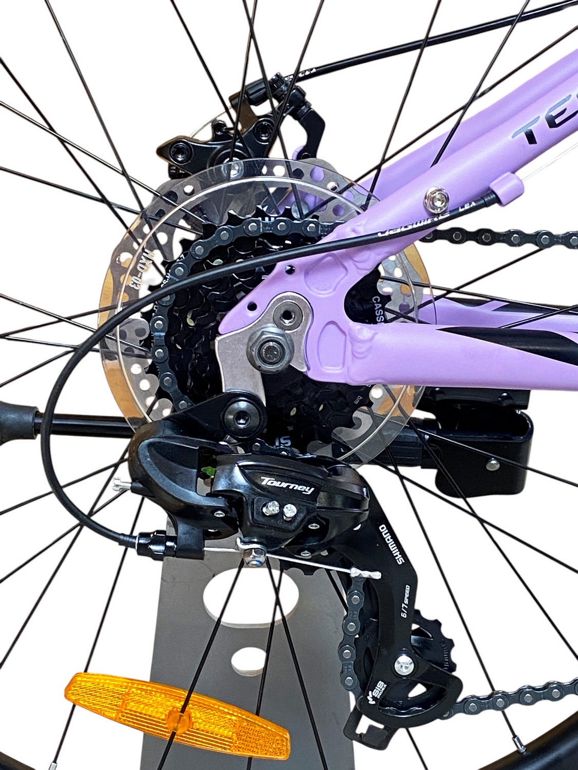 Подростковый велосипед для девочек с оборудованием начального класса Shimano/Microshift, 7 скоростей. Технические особенности: алюминиевая рама (частично скрытая проводка, прямой рулевой стакан, кареточный стакан BSA, съемный петух, крепление калипера IS), амортизационная вилка (пружинно-эластомерная, крепление калипера IS), двойные алюминиевые обода (под ниппель AV), дисковые механические тормоза (роторы 160/160 мм), защита цепи, пластиковые крылья, катафоты, подножка. Подходит для прогулочного катания по различным дорогам и пересеченной местности. Диаметр колес - 24 дюйма. Вес - 14 кг.