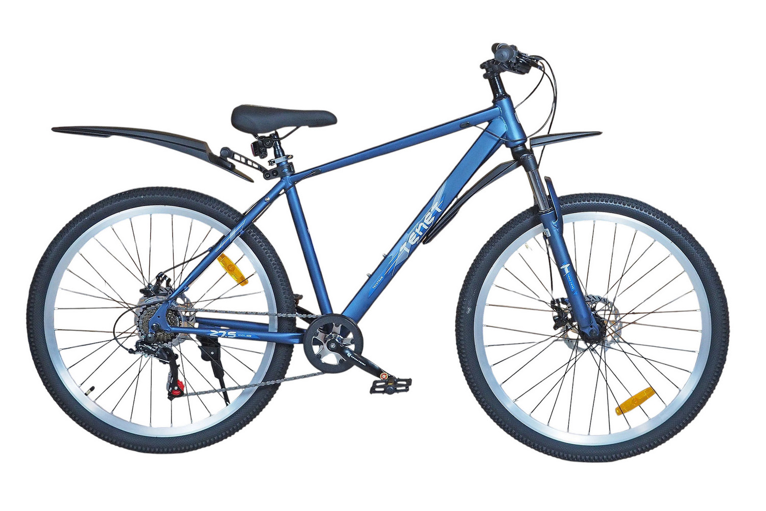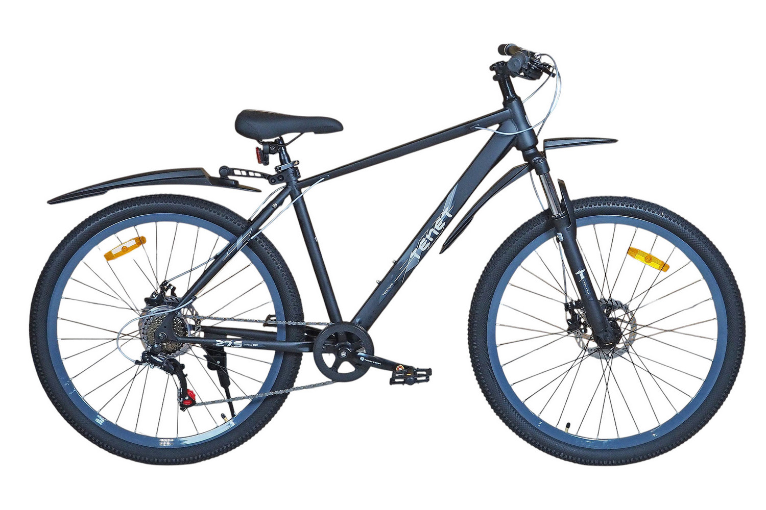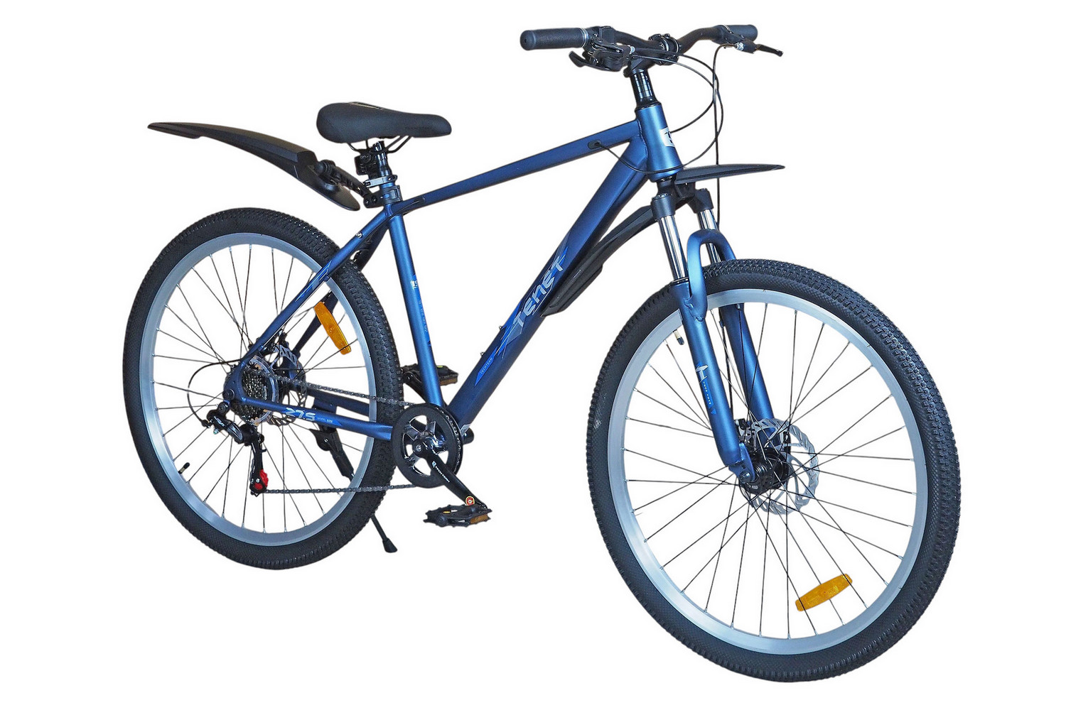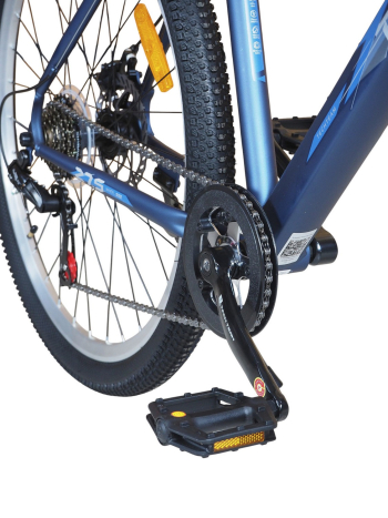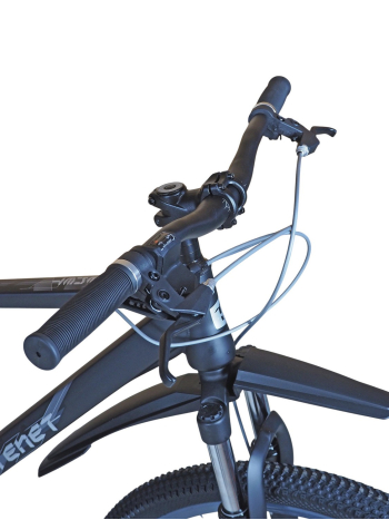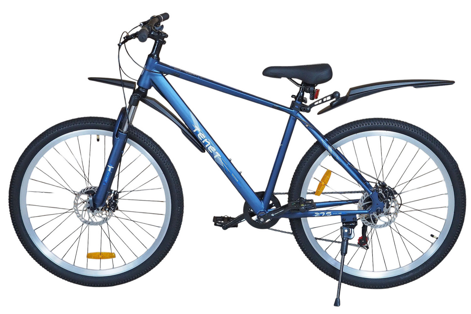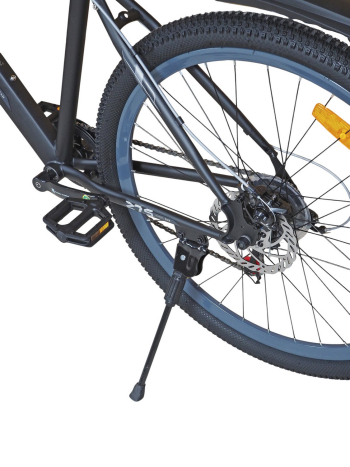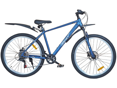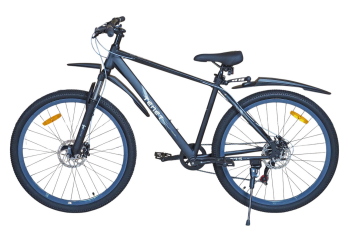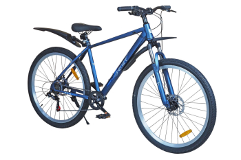 Горный велосипед начального уровня с оборудованием начального класса Shimano/Microshift, 7 скоростей. Технические особенности: прочная стальная рама (частично скрытая проводка тросов, прямой рулевой стакан, кареточный стакан BSA, интегрированный петух, крепление калипера IS), амортизационная вилка (пружинно-эластомерная, крепление калипера IS), двойные алюминиевые обода (под ниппель AV), дисковые механические тормоза (роторы 160/160 мм), защита цепи, катафоты, пластиковые крылья, подножка. Подходит для прогулочной езды по шоссе и ровным проселочным дорогам. Диаметр колес - 27,5 дюймов. Вес - 17,5 кг.