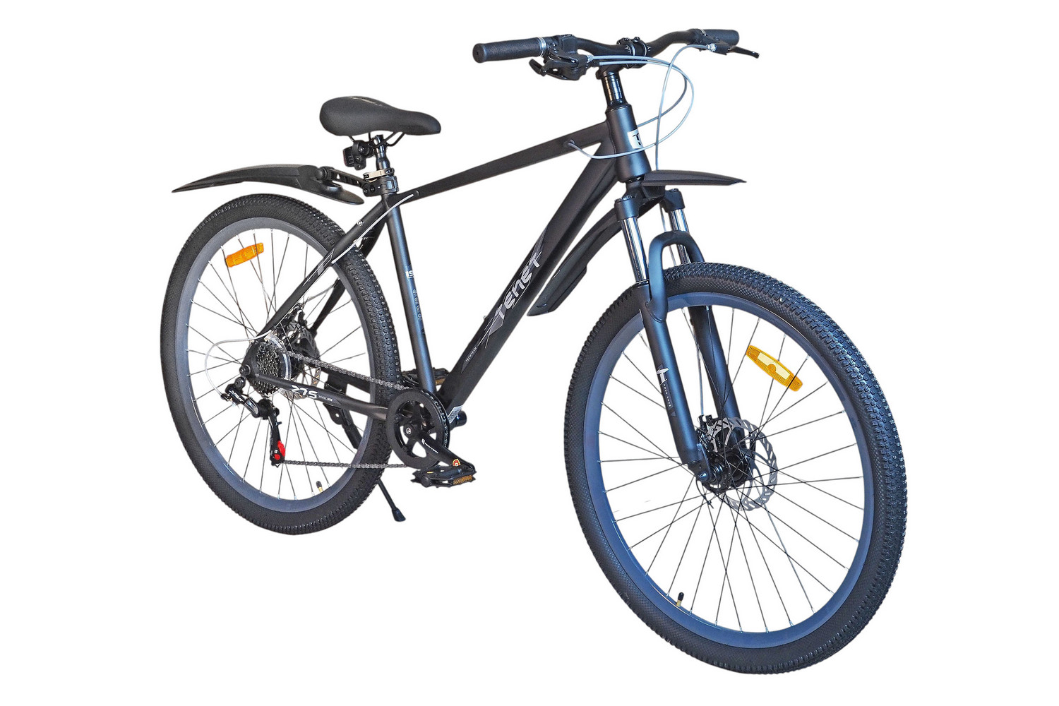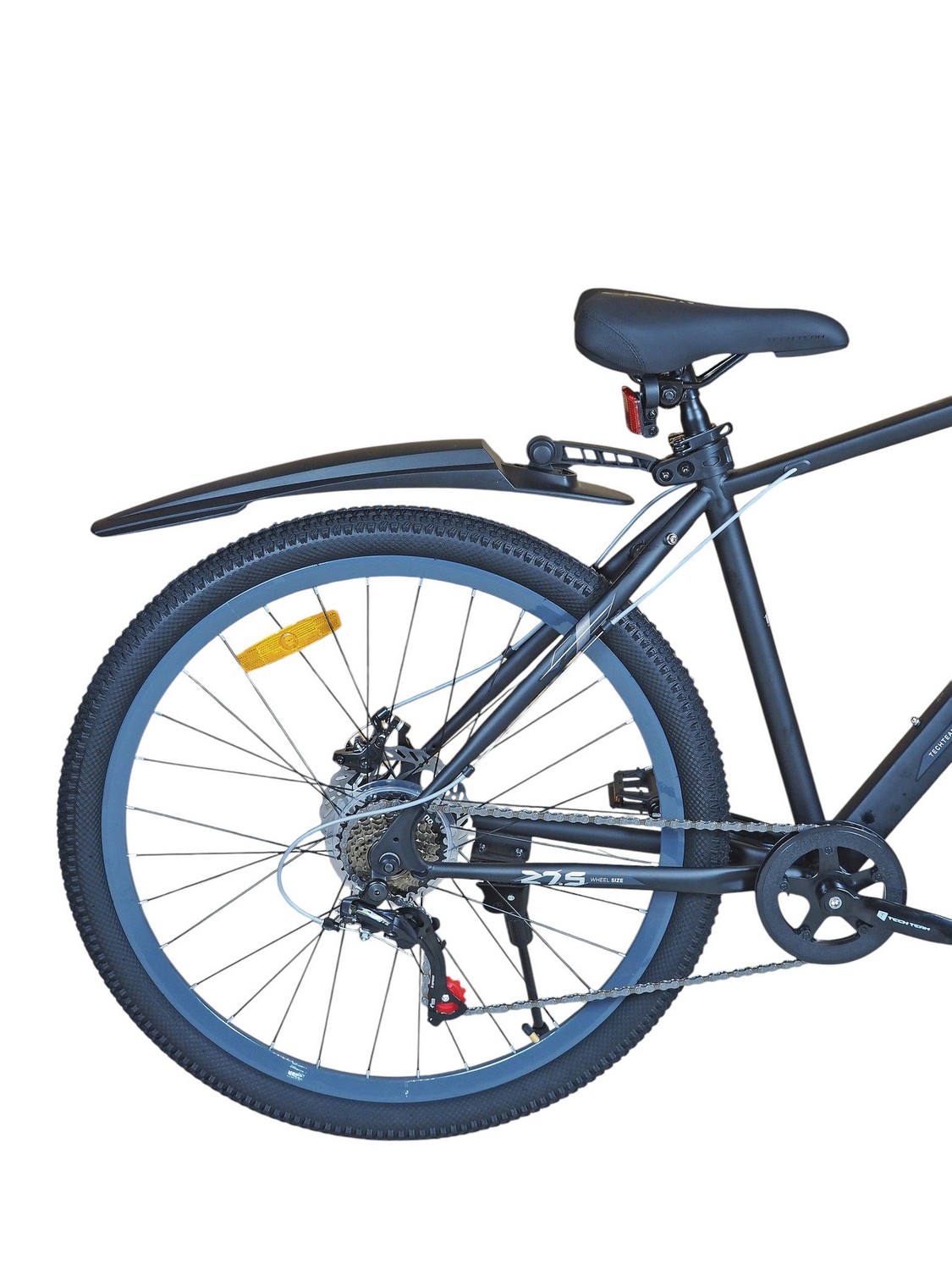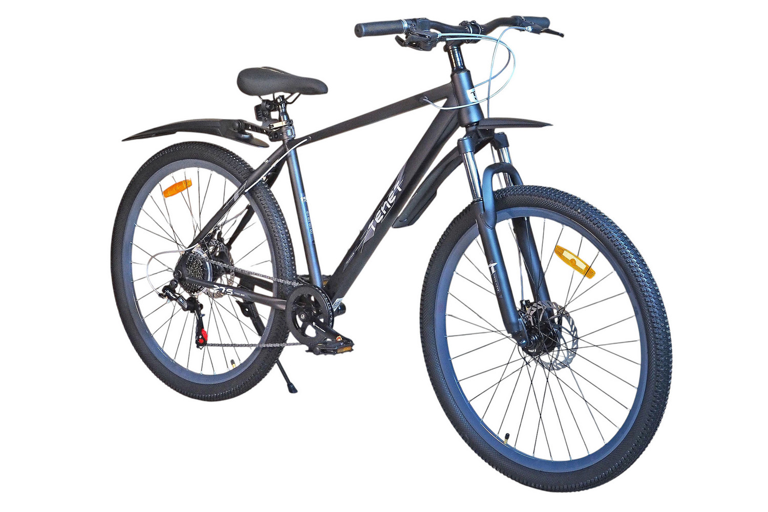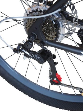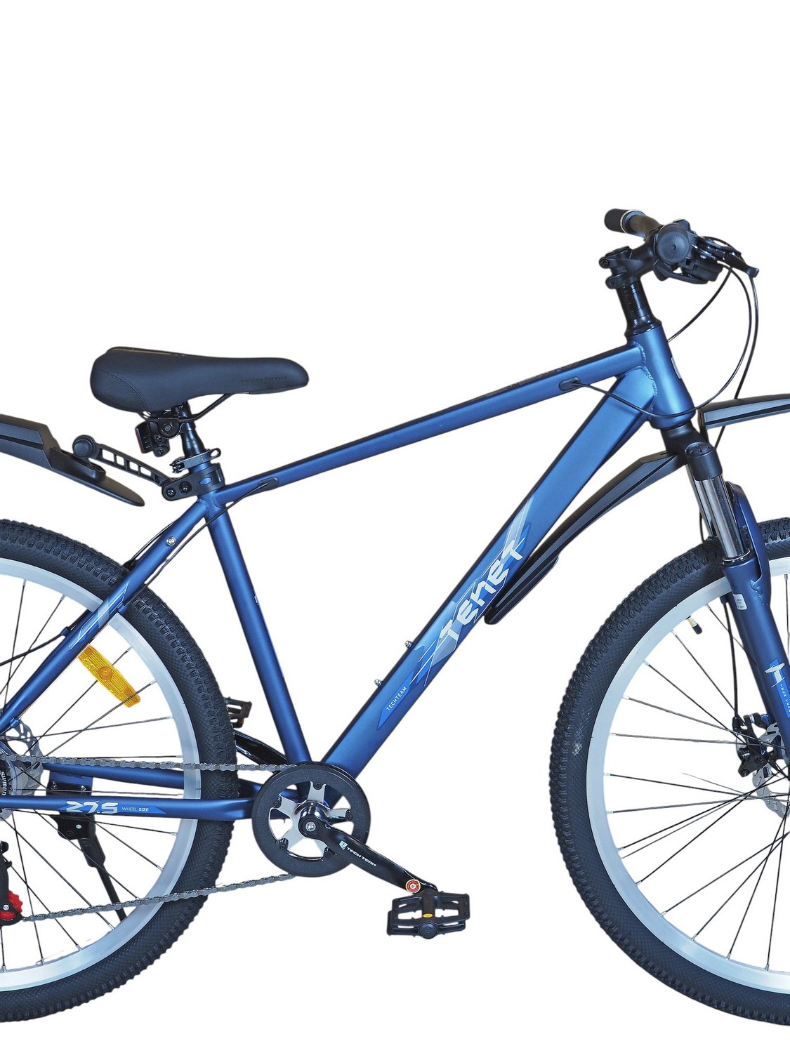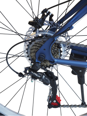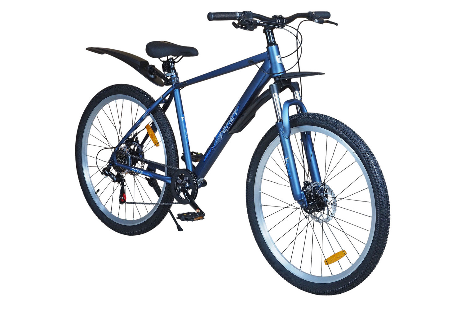 Горный велосипед начального уровня с оборудованием начального класса Shimano/Microshift, 7 скоростей. Технические особенности: прочная стальная рама (частично скрытая проводка тросов, прямой рулевой стакан, кареточный стакан BSA, интегрированный петух, крепление калипера IS), амортизационная вилка (пружинно-эластомерная, крепление калипера IS), двойные алюминиевые обода (под ниппель AV), дисковые механические тормоза (роторы 160/160 мм), защита цепи, катафоты, пластиковые крылья, подножка. Подходит для прогулочной езды по шоссе и ровным проселочным дорогам. Диаметр колес - 27,5 дюймов. Вес - 17,5 кг.