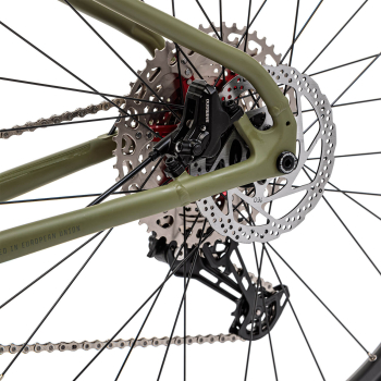 - легкая алюминиевая рама (сплав 6061, дропауты под ось Boost, сглаженные сварные швы, скрытая проводка, конический рулевой шток, трейловая геометрия, совместимость с дроппером, универсальный петух UDH, крепление калипера Post Mount),