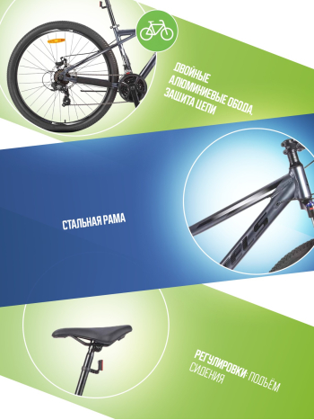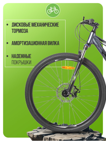 Горный велосипед с оборудованием начального класса Shimano, 21 скорость. Технические особенности: легкая алюминиевая рама (сплав 6061, скрытая проводка, прямой рулевой стакан, кареточный стакан BSA, съемный петух), амортизационная вилка Uding (пружинно-эластомерная, ход 80 мм, блокировка хода, регулировка преднагрузки, штаны из магниевого сплава, алюминиевая корона, крепление калипера Post Mount), двойные алюминиевые обода (под AV ниппель), дисковые механические тормоза (роторы 180/160 мм), защита цепи, подножка, катафоты. Подходит для прогулочной езды по различным дорогам и пересеченной местности. Диаметр колес - 29 дюймов. Вес - 16 кг.