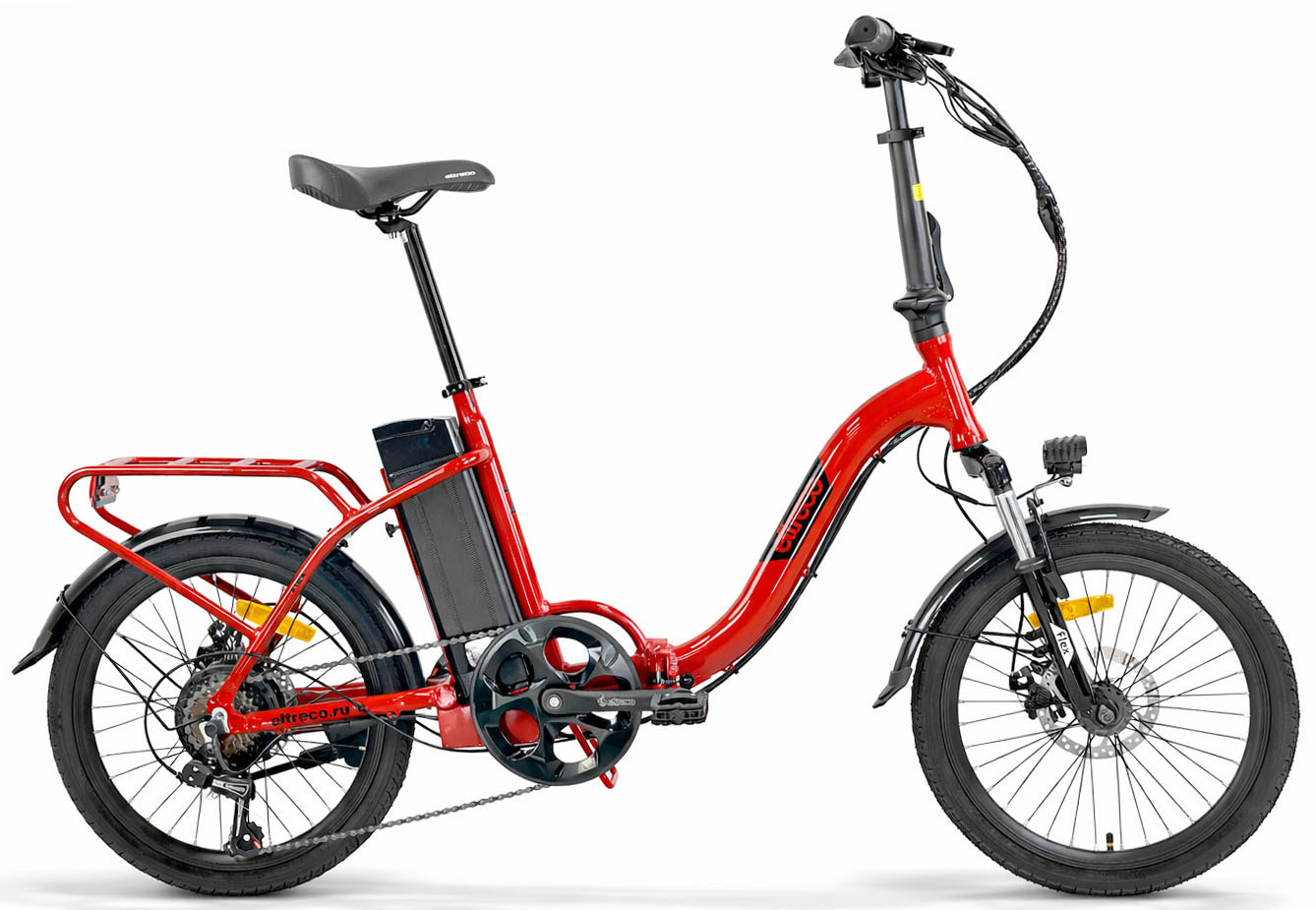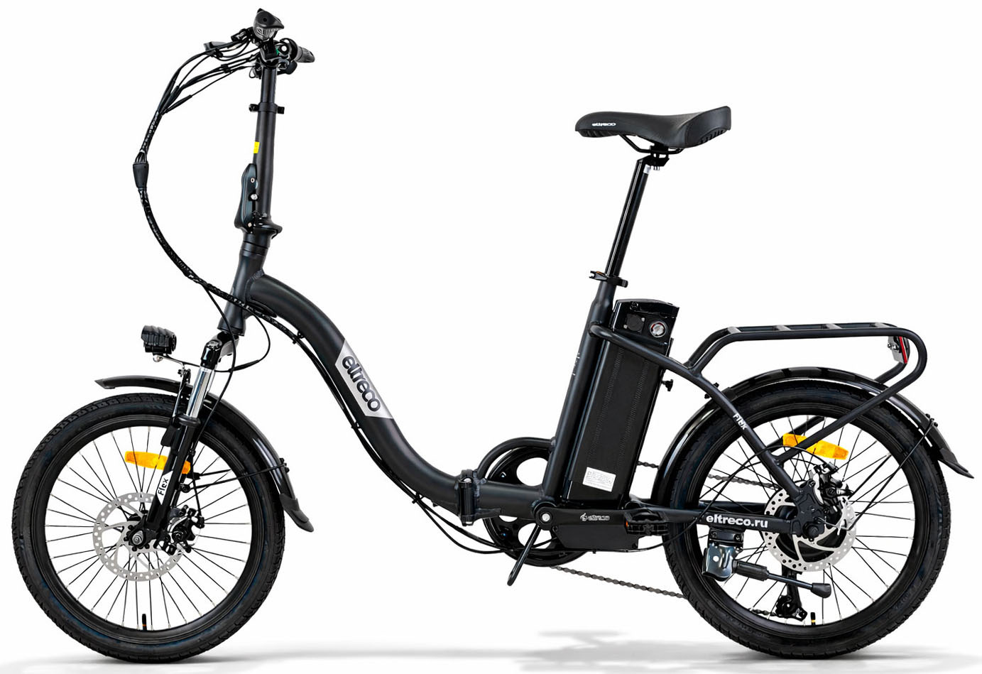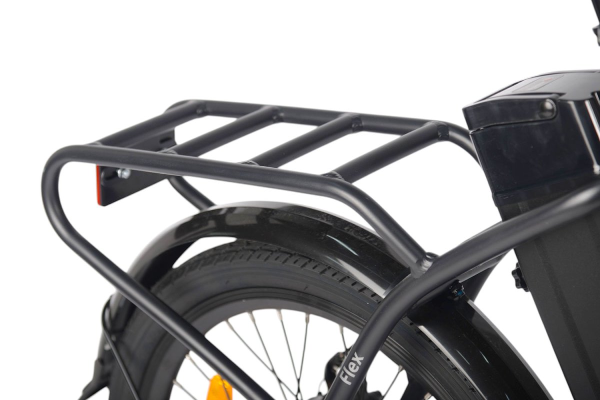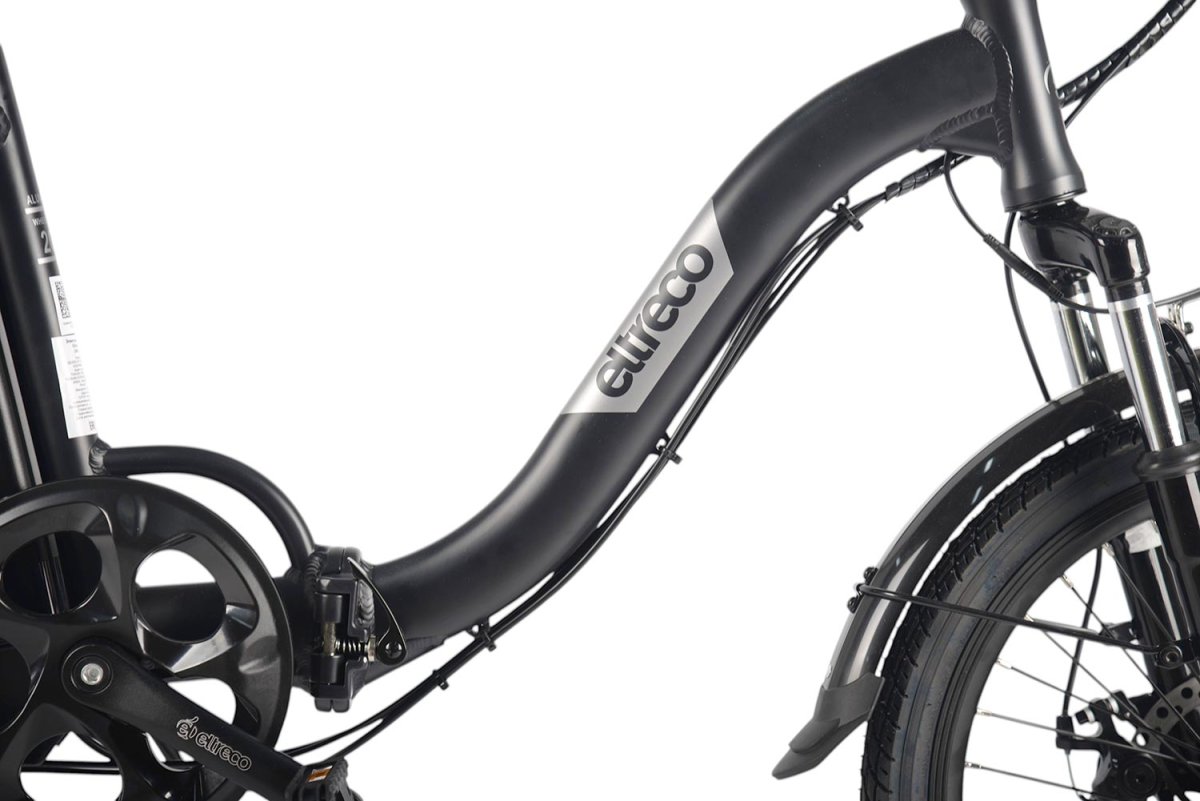 - алюминиевая рама (складной механизм, заниженная геометрия, открытая проводка, прямой рулевой стакан, кареточный стакан BSA, интегрированный багажник, съемный петух),