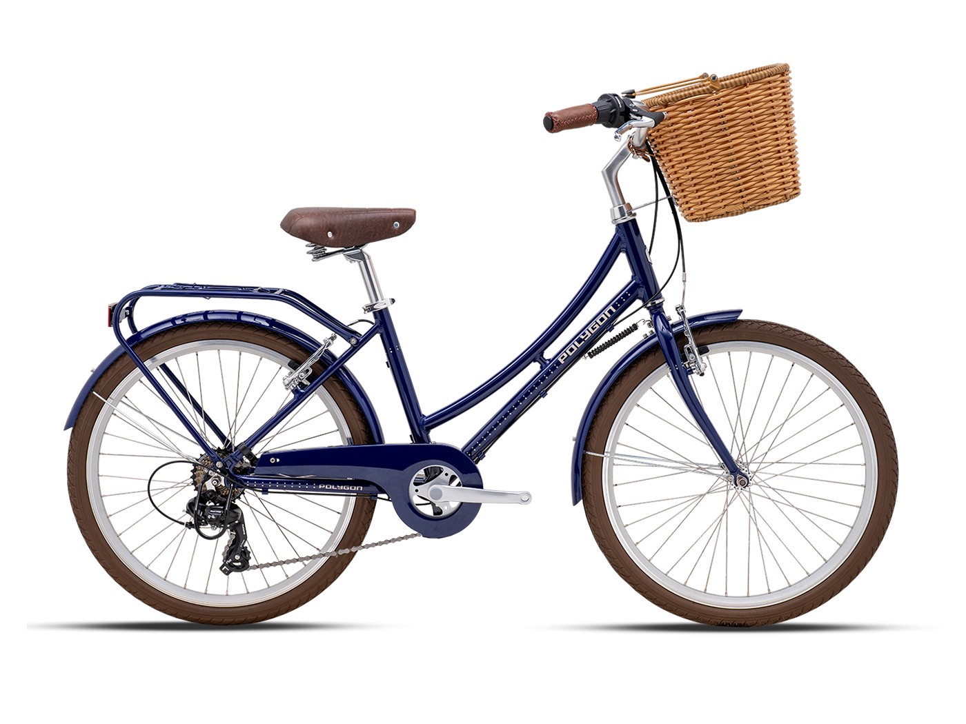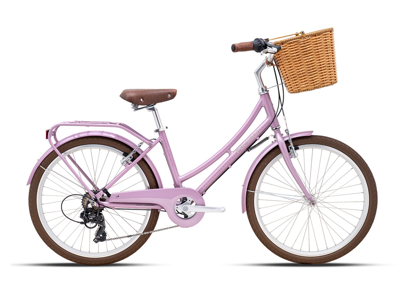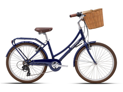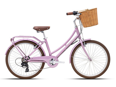 Женский дорожный велосипед с навесным оборудованием Shimano, 7 скоростей. Технические особенности: алюминиевая рама AL6 Alloy Frame (комфортная прогулочная геометрия, открытая проводка, прямой рулевой стакан, кареточный стакан BSA, съемный петух), жесткая стальная вилка Hi-Ten Steel Rigid, двойные алюминиевые обода, надежные ободные тормоза V-Brake (алюминиевые рычаги), длинные крылья, защита цепи, багажник, комфортное седло, передняя корзина, защита заднего переключателя, катафоты. Подходит для прогулочного катания в городских условиях и по несложным маршрутам в лесу. Диаметр колес - 24 дюйма. Вес - 14,4 кг.