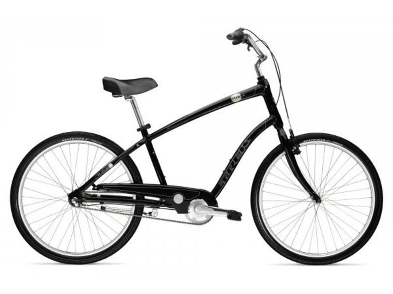 Круизер с оборудованием Shimano Nexus и 3-скоростями, алюминиевая рама Alpha White Aluminum, вилка High tensile steel, обода Alloy front hub, steel bolt-on rear hub; 36-hole rims, ножной тормоз. Тормоза Tektro V w/Tektro levers, Kraton inserts. Подходит для прогулочной езды.