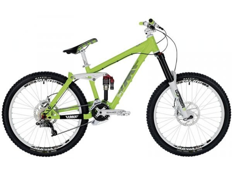Экстремальный двухподвес с оборудованием профессионального класса Sram X.9, 18-скоростей, алюминиевая рама 2010 Freddy, передний амортизатор 66 RC3 1.5-1-1/8" 20mm, задний амортизатор Marzocchi Air RC World Cup, двойные обода SUPRA 34 eyelet 36H, дисковые гидравлические тормоза Hayes Stroker ACE, 203mm. Подходит для экстремальной езды по бездорожью различных погодных условиях (дождь, снег). Вес - 17,6 кг.