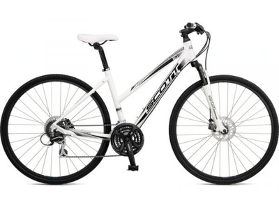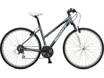 Женский хардтейл с оборудованием любительского уровня Shimano Acera, алюминиевой рама Contessa Sport, амортизационной вилка SR Suntour XCM, 100mm, 21 скорость, двойные обода Araya GP-710, ободные механические тормоза Scott Comp. Подходит для обучения и лёгкий прогулок.