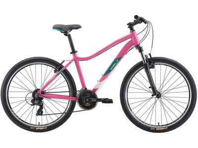 Женский горный велосипед с оборудованием начального класса Shimano, 21 скорость. Технические особенности: алюминиевая рама Alloy 6061, амортизационная вилка Hagen ES-451 (пружинно-эластомерная, ход 60 мм), двойные алюминиевые обода Radiant Sport, дисковые механические тормоза Artek MD-13. Подходит для прогулочной езды по различным дорогам и пересеченной местности. Диаметр колес - 27,5 дюймов. Вес - 14,6 кг.