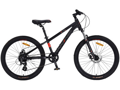 Велосипед, предназначенный для детей в возрасте от восьми до тринадцати лет, с оборудованием начального любительского класса Shimano, 7 скоростей. Технические особенности: легкая алюминиевая рама (сплав 6061, сглаженные швы, скрытая прокладка тросов, кареточный стакан BSA, прямой рулевой стакан ZS, съёмный петух), жесткая алюминиевая вилка (сплав 6061, сглаженные швы, дропауты 10 мм), двойные алюминиевые обода (под ниппель AV), надежные ободные тормоза YX-C18D V-Brake, защита цепи. Подходит для прогулочного катания в городских условиях и по несложным маршрутам в лесу. Диаметр колес - 24 дюйма. Вес - 10,5 кг.
