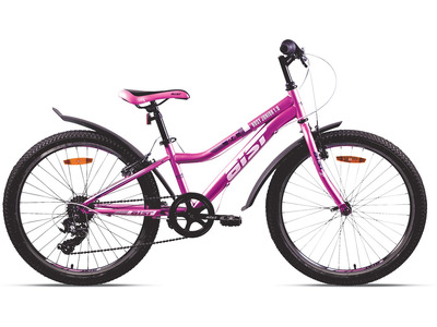 Велосипед, предназначенный для девочек в возрасте от восьми до тринадцати лет, с оборудованием начального класса Shimano, 7 скоростей. Технические особенности: легкая алюминиевая рама (сплав 6061, частично скрытая проводка, кареточный стакан BSA, крепление калипера IS, съемный петух, бонки для багажника и флягодержателя), амортизационная вилка (пружинная, ход 50 мм, крепление калипера IS), двойные алюминиевые обода (под AV ниппель), дисковые механические тормоза (роторы 160/160 мм), защита цепи, подножка, катафоты. Подходит для прогулочного катания в городских условиях и по несложным маршрутам в лесу. Диаметр колес - 24 дюйма. Вес - 13 кг.