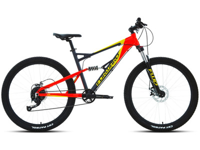 Надежный двухподвес начального уровня с оборудованием начального любительского класса Shimano, 9 скоростей. Технические особенности: алюминиевая рама сплав 6061, амортизационная вилка FWD 688 TNL с ходом 120 мм, двойные обода FWD Double Wall, дисковые механические тормоза Tektro MD-M280. Подходит для активной езды по различным дорогам и пересеченной местности. Диаметр колес - 27,5 дюймов. Вес - 15,4 кг.