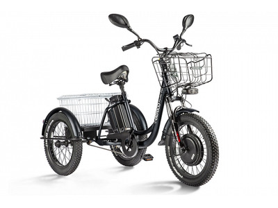Трехколесный грузовой велогибрид без переключения передач. Технические особенности: алюминиевая рама, амортизационная вилка, двойные алюминиевые обода, передний тормоз - дисковый механический, задний - барабанный, электродвигатель 500W, аккумулятор Li-ion 48V/10Ah, защита цепи, система освещения, LСD-дисплей, зеркала заднего вида, передняя и задняя корзины. Максимальная нагрузка - 120 кг. Максимальная скорость - до 30 км/ч. Пробег на одной зарядке - до 40 км. Подходит для прогулочной езды по шоссе и ровным проселочным дорогам, а также для перевозки различных грузов. Диаметр колес - 20 дюймов. Вес - 45 кг.