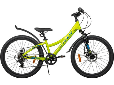 Велосипед, предназначенный для детей в возрасте от восьми до тринадцати лет, с оборудованием начального класса Shimano, 21 скорость. Технические особенности: легкая алюминиевая рама, амортизационная вилка (ход 50 мм), двойные алюминиевые обода, дисковые механические тормоза (роторы 160/160 мм), защита цепи, звонок, катафоты, подножка, защита заднего переключателя. Подходит для прогулочного катания в городских условиях и по несложным маршрутам в лесу. Диаметр колес - 24 дюйма. Вес - 14,84 кг.