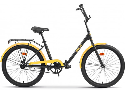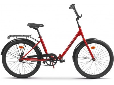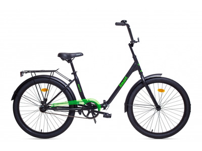 Складной прогулочный велосипед без переключения передач. Технические особенности: прочная стальная рама (складной механизм, прямой рулевой стакан), жесткая стальная вилка, одинарные алюминиевые обода (под AV ниппель), ножной педальный тормоз, пластиковая защита цепи, полноразмерные крылья, задний багажник, подножка, катафоты, звонок. Подходит для прогулочной езды по шоссе и ровным проселочным дорогам. Диаметр колес - 24 дюйма. Вес - 15,7 кг.