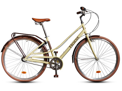 Женский дорожный велосипед без переключения передач. Технические особенности: стальная рама Hi-Ten, жесткая стальная вилка, двойные алюминиевые обода, ножные педальные тормоза, защита цепи, длинные крылья, багажник, комфортное седло, звонок. Подходит для прогулочного катания в городских условиях и по несложным маршрутам в лесу. Диаметр колес - 28 дюймов. Вес - 17,31 кг.