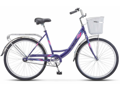 Женский дорожный велосипед без переключения передач. Технические особенности: прочная стальная рама Hi-Ten, жесткая стальная вилка, двойные алюминиевые обода, ножные педальные тормоза, защита цепи, длинные крылья, багажник, передняя корзина, звонок. Подходит для прогулочной езды по шоссе и ровным проселочным дорогам. Диаметр колес - 26 дюймов. Вес - 16,6 кг.