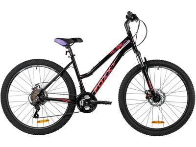 Женский горный велосипед с навесным оборудованием Shimano, 21 скорость. Технические особенности: прочная стальная рама (открытая проводка, прямой рулевой стакан, кареточный стакан BSA, интегрированный петух, крепление калипера IS), амортизационная вилка Foxxshox (пружинно-эластомерная, ход 50 мм, алюминиевая корона, сталь/алюминий, крепление калипера IS), двойные алюминиевые обода (под AV ниппель), дисковые механические тормоза (роторы 160/160 мм, крепление на 6 болтов), подножка, катафоты. Подходит для прогулочной езды по различным дорогам и пересеченной местности. Диаметр колес - 26 дюймов. Вес - 17 кг.