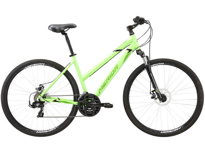 Комфортабельный женский велосипед с оборудованием любительского класса Shimano, 24 скорости. Технические особенности: алюминиевая рама Crossway Speed L, амортизационная вилка SR Suntour NEX HLO с ходом 63 мм, двойные обода Merida CC, дисковые гидравлические тормоза Shimano ST-EF505, амортизированный подседельный штырь, регулируемый вынос. Подходит для комфортного катания по паркам, городским улицам и по маршрутам средней сложности в лесу. Диаметр колес - 28 дюймов. Вес - 13,88 кг.