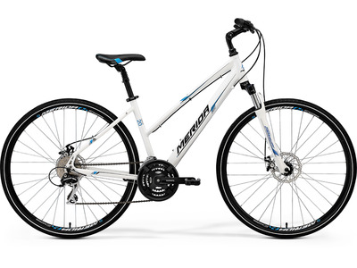Комфортабельный женский велосипед с оборудованием любительского класса Shimano, 24 скорости. Технические особенности: алюминиевая рама Crossway Speed L, амортизационная вилка Suntour NEX HLO с ходом 63 мм, двойные обода Merida CC, дисковые гидравлические тормоза Shimano ST-EF505, амортизированный подседельный штырь, регулируемый вынос. Подходит для комфортного катания по паркам, городским улицам и по маршрутам средней сложности в лесу. Диаметр колес - 28 дюймов. Вес - 14,9 кг.