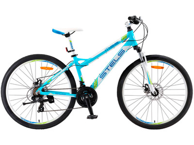 Женский горный велосипед с оборудованием начального класса Shimano, 21 скорость. Технические особенности: алюминиевая рама, амортизационная вилка ход 80 мм, двойные алюминиевые обода, дисковые механические тормоза Stels. Подходит для прогулочной езды по различным дорогам и пересеченной местности. Диаметр колес - 26 дюймов. Вес - 14,4 кг.