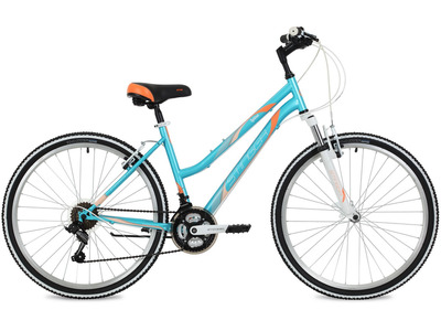 Женский горный велосипед с оборудованием начального класса, 21 скорость. Технические особенности: прочная стальная рама Hi-Ten, амортизационная вилка с ходом 50 мм, двойные алюминиевые обода, надежные ободные тормоза V-brake. Подходит для прогулочного катания по различным дорогам и пересеченной местности. Диаметр колес - 26 дюймов. Вес - 17,12 кг.